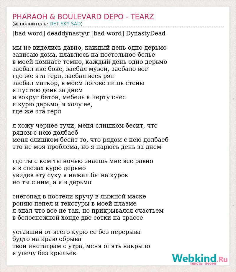 [bad word] deaddynasty\r [bad word] DynastyDead мы не виделись давно, каждый день одно дерьмо зависаю дома, плавлюсь на постельное белье в моей комнате темно, каждый день одно дерьмо заебал икс бокс, заебал музон, заебало все где же эта герл, заебал весь рэп заебал маткор, в моем логове лишь стены я пустею день за днем и вокруг бетон, мебель к черту снес я курю дерьмо, я хочу ее, где же эта герл я хожу чернее тучи, меня слишком бесит, что рядом с нею долбаеб меня слишком бесит то, что рядом с нею долбаеб это не моя проблема, но я парюсь день за днем где ты с кем ты ночью знаешь мне все равно я в слезах курю дерьмо увидев эту суку я нажал бы на курок но ты с ним, а я в дерьмо снегопад в постели кручу в лыжной маске роняю пепел и текстуры в моей плазме я знал что все не так, но прикрывался счастьем в белоснежной хонде две сотки на трассе уставший от всего курю ее без перерыва будто на краю обрыва твой инстаграм с утра, меня опять накрыло я улечу без крыльев