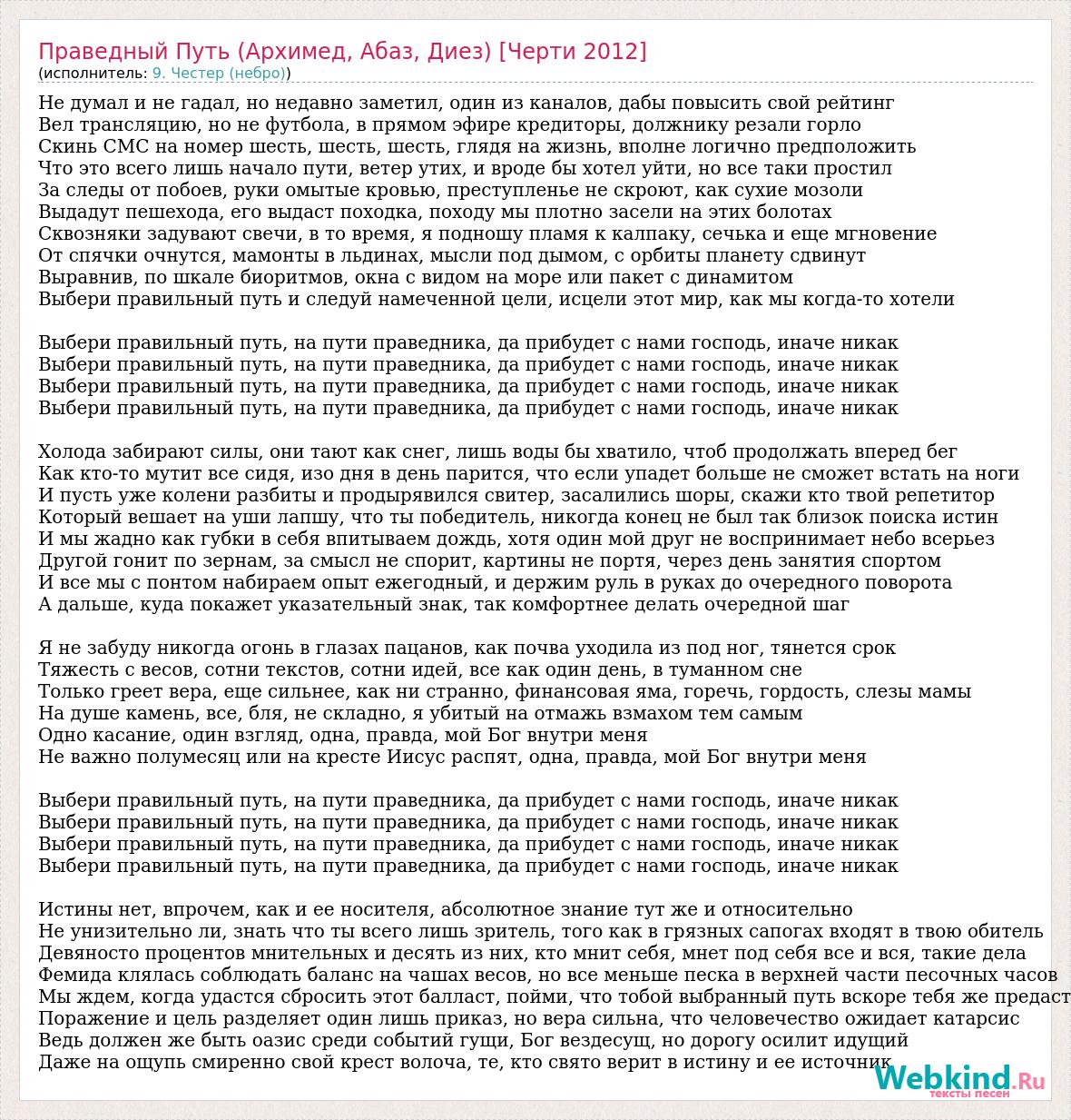 Не думал и не гадал, но недавно заметил, один из каналов, дабы повысить свой рейтинг Вел трансляцию, но не футбола, в прямом эфире кредиторы, должнику резали горло Скинь СМС на номер шесть, шесть, шесть, глядя на жизнь, вполне логично предположить Что это всего лишь начало пути, ветер утих, и вроде бы хотел уйти, но все таки простил За следы от побоев, руки омытые кровью, преступленье не скроют, как сухие мозоли Выдадут пешехода, его выдаст походка, походу мы плотно засели на этих болотах Сквозняки задувают свечи, в то время, я подношу пламя к калпаку, сечька и еще мгновение От спячки очнутся, мамонты в льдинах, мысли под дымом, с орбиты планету сдвинут Выравнив, по шкале биоритмов, окна с видом на море или пакет с динамитом Выбери правильный путь и следуй намеченной цели, исцели этот мир, как мы когда-то хотели Выбери правильный путь, на пути праведника, да прибудет с нами господь, иначе никак Выбери правильный путь, на пути праведника, да прибудет с нами господь, иначе никак Выбери правильный путь, на пути праведника, да прибудет с нами господь, иначе никак Выбери правильный путь, на пути праведника, да прибудет с нами господь, иначе никак Холода забирают силы, они тают как снег, лишь воды бы хватило, чтоб продолжать вперед бег Как кто-то мутит все сидя, изо дня в день парится, что если упадет больше не сможет встать на ноги И пусть уже колени разбиты и продырявился свитер, засалились шоры, скажи кто твой репетитор Который вешает на уши лапшу, что ты победитель, никогда конец не был так близок поиска истин И мы жадно как губки в себя впитываем дождь, хотя один мой друг не воспринимает небо всерьез Другой гонит по зернам, за смысл не спорит, картины не портя, через день занятия спортом И все мы с понтом набираем опыт ежегодный, и держим руль в руках до очередного поворота А дальше, куда покажет указательный знак, так комфортнее делать очередной шаг Я не забуду никогда огонь в глазах пацанов, как почва уходила из под ног, тянется срок Тяжесть с весов, сотни текстов, сотни идей, все как один день, в туманном сне Только греет вера, еще сильнее, как ни странно, финансовая яма, горечь, гордость, слезы мамы На душе камень, все, бля, не складно, я убитый на отмажь взмахом тем самым Одно касание, один взгляд, одна, правда, мой Бог внутри меня Не важно полумесяц или на кресте Иисус распят, одна, правда, мой Бог внутри меня Выбери правильный путь, на пути праведника, да прибудет с нами господь, иначе никак Выбери правильный путь, на пути праведника, да прибудет с нами господь, иначе никак Выбери правильный путь, на пути праведника, да прибудет с нами господь, иначе никак Выбери правильный путь, на пути праведника, да прибудет с нами господь, иначе никак Истины нет, впрочем, как и ее носителя, абсолютное знание тут же и относительно Не унизительно ли, знать что ты всего лишь зритель, того как в грязных сапогах входят в твою обитель Девяносто процентов мнительных и десять из них, кто мнит себя, мнет под себя все и вся, такие дела Фемида клялась соблюдать баланс на чашах весов, но все меньше песка в верхней части песочных часов Мы ждем, когда удастся сбросить этот балласт, пойми, что тобой выбранный путь вскоре тебя же предаст Поражение и цель разделяет один лишь приказ, но вера сильна, что человечество ожидает катарсис Ведь должен же быть оазис среди событий гущи, Бог вездесущ, но
