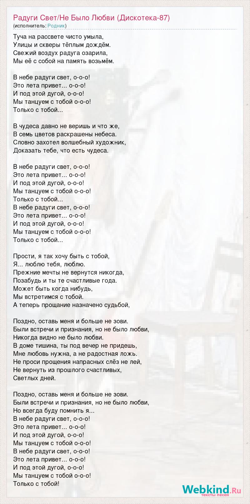 Туча на рассвете чисто умыла, Улицы и скверы тёплым дождём. Свежий воздух радуга озарила, Мы её с собой на память возьмём. В небе радуги свет, о-о-о! Это лета привет... о-о-о! И под этой дугой, о-о-о! Мы танцуем с тобой о-о-о! Только с тобой... В чудеса давно не веришь и что же, В семь цветов раскрашены небеса. Словно захотел волшебный художник, Доказать тебе, что есть чудеса. В небе радуги свет, о-о-о! Это лета привет... о-о-о! И под этой дугой, о-о-о! Мы танцуем с тобой о-о-о! Только с тобой... В небе радуги свет, о-о-о! Это лета привет... о-о-о! И под этой дугой, о-о-о! Мы танцуем с тобой о-о-о! Только с тобой... Прости, я так хочу быть с тобой, Я... люблю тебя, люблю. Прежние мечты не вернутся никогда, Позабудь и ты те счастливые года. Может быть когда нибудь, Мы встретимся с тобой. А теперь прощание назначено судьбой, Поздно, оставь меня и больше не зови. Были встречи и признания, но не было любви, Никогда видно не было любви. В доме тишина, ты под вечер не придешь, Мне любовь нужна, а не радостная ложь. Не проси прощения напрасных слёз не лей, Не вернуть из прошлого счастливых, Светлых дней. Поздно, оставь меня и больше не зови. Были встречи и признания, но не было любви, Но всегда буду помнить я... В небе радуги свет, о-о-о! Это лета привет... о-о-о! И под этой дугой, о-о-о! Мы танцуем с тобой о-о-о! В небе радуги свет, о-о-о! Это лета привет... о-о-о! И под этой дугой, о-о-о! Мы танцуем с тобой о-о-о! Только с тобой!
