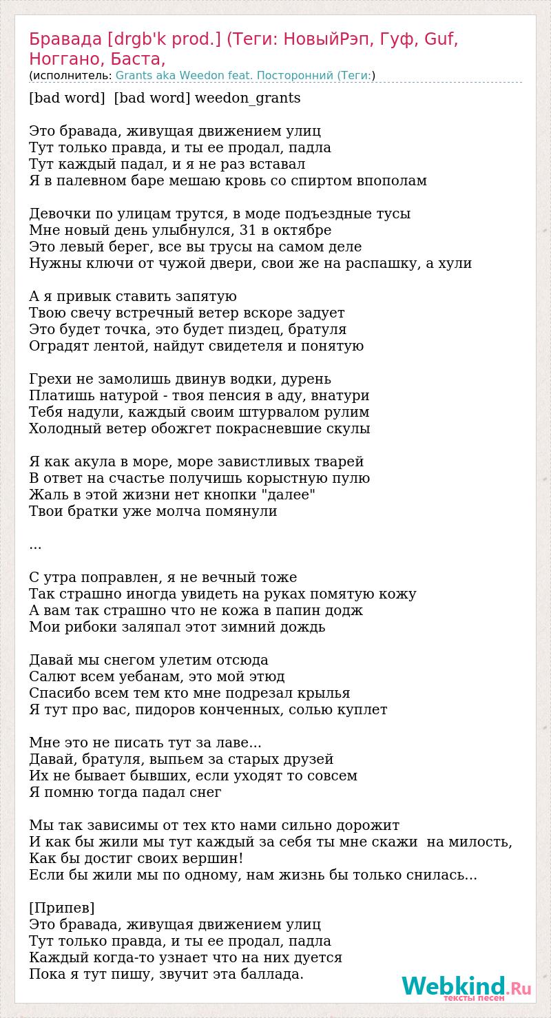 [bad word] [bad word] weedon_grants Это бравада, живущая движением улиц Тут только правда, и ты ее продал, падла Тут каждый падал, и я не раз вставал Я в палевном баре мешаю кровь со спиртом впополам Девочки по улицам трутся, в моде подъездные тусы Мне новый день улыбнулся, 31 в октябре Это левый берег, все вы трусы на самом деле Нужны ключи от чужой двери, свои же на распашку, а хули А я привык ставить запятую Твою свечу встречный ветер вскоре задует Это будет точка, это будет пиздец, братуля Оградят лентой, найдут свидетеля и понятую Грехи не замолишь двинув водки, дурень Платишь натурой - твоя пенсия в аду, внатури Тебя надули, каждый своим штурвалом рулим Холодный ветер обожгет покрасневшие скулы Я как акула в море, море завистливых тварей В ответ на счастье получишь корыстную пулю Жаль в этой жизни нет кнопки "далее" Твои братки уже молча помянули ... С утра поправлен, я не вечный тоже Так страшно иногда увидеть на руках помятую кожу А вам так страшно что не кожа в папин додж Мои рибоки заляпал этот зимний дождь Давай мы снегом улетим отсюда Салют всем уебанам, это мой этюд Спасибо всем тем кто мне подрезал крылья Я тут про вас, пидоров конченных, солью куплет Мне это не писать тут за лаве... Давай, братуля, выпьем за старых друзей Их не бывает бывших, если уходят то совсем Я помню тогда падал снег Мы так зависимы от тех кто нами сильно дорожит И как бы жили мы тут каждый за себя ты мне скажи на милость, Как бы достиг своих вершин! Если бы жили мы по одному, нам жизнь бы только снилась... [Припев] Это бравада, живущая движением улиц Тут только правда, и ты ее продал, падла Каждый когда-то узнает что на них дуется Пока я тут пишу, звучит эта баллада.