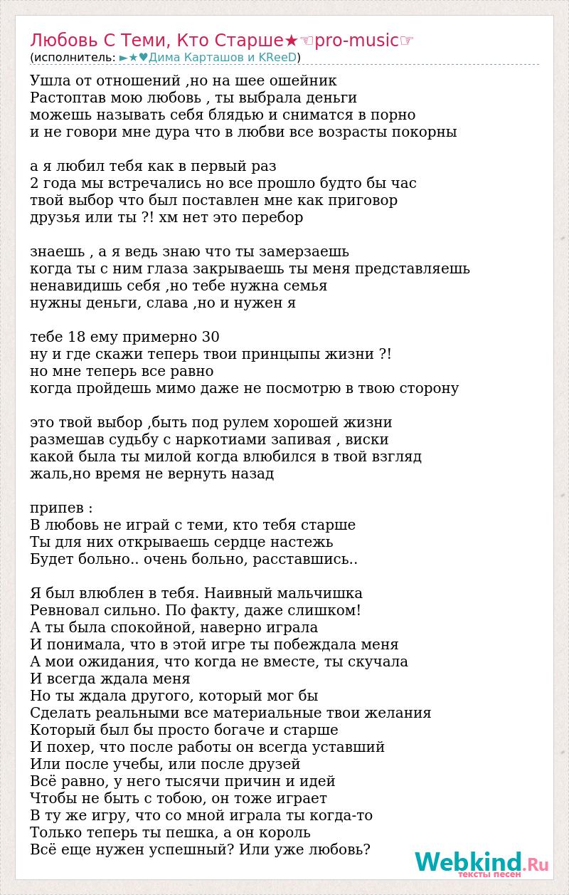 Ушла от отношений ,но на шее ошейник Растоптав мою любовь , ты выбрала деньги можешь называть себя блядью и сниматся в порно и не говори мне дура что в любви все возрасты покорны а я любил тебя как в первый раз 2 года мы встречались но все прошло будто бы час твой выбор что был поставлен мне как приговор друзья или ты ?! хм нет это перебор знаешь , а я ведь знаю что ты замерзаешь когда ты с ним глаза закрываешь ты меня представляешь ненавидишь себя ,но тебе нужна семья нужны деньги, слава ,но и нужен я тебе 18 ему примерно 30 ну и где скажи теперь твои принцыпы жизни ?! но мне теперь все равно когда пройдешь мимо даже не посмотрю в твою сторону это твой выбор ,быть под рулем хорошей жизни размешав судьбу с наркотиами запивая , виски какой была ты милой когда влюбился в твой взгляд жаль,но время не вернуть назад припев : В любовь не играй с теми, кто тебя старше Ты для них открываешь сердце настежь Будет больно.. очень больно, расставшись.. Я был влюблен в тебя. Наивный мальчишка Ревновал сильно. По факту, даже слишком! А ты была спокойной, наверно играла И понимала, что в этой игре ты побеждала меня А мои ожидания, что когда не вместе, ты скучала И всегда ждала меня Но ты ждала другого, который мог бы Сделать реальными все материальные твои желания Который был бы просто богаче и старше И похер, что после работы он всегда уставший Или после учебы, или после друзей Всё равно, у него тысячи причин и идей Чтобы не быть с тобою, он тоже играет В ту же игру, что со мной играла ты когда-то Только теперь ты пешка, а он король Всё еще нужен успешный? Или уже любовь?