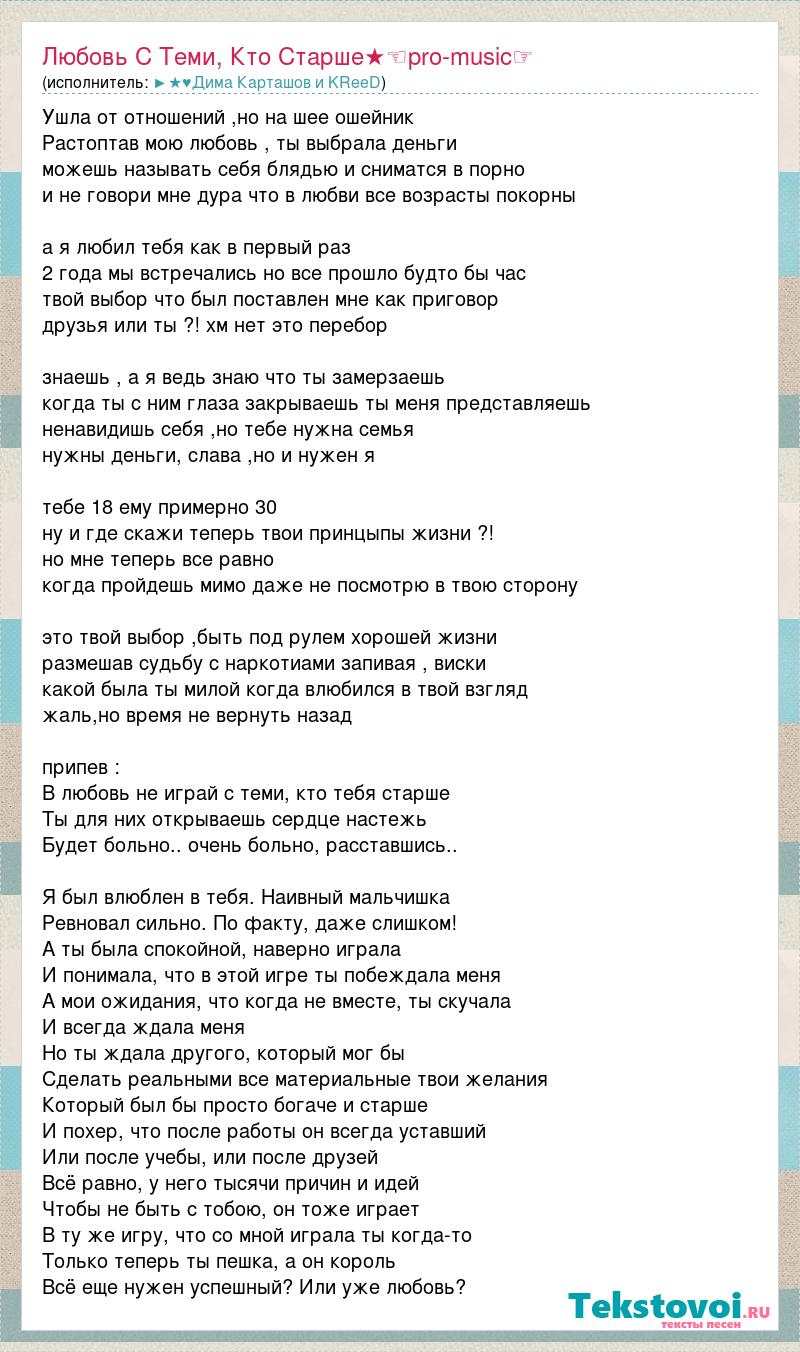 Ушла от отношений ,но на шее ошейник Растоптав мою любовь , ты выбрала деньги можешь называть себя блядью и сниматся в порно и не говори мне дура что в любви все возрасты покорны а я любил тебя как в первый раз 2 года мы встречались но все прошло будто бы час твой выбор что был поставлен мне как приговор друзья или ты ?! хм нет это перебор знаешь , а я ведь знаю что ты замерзаешь когда ты с ним глаза закрываешь ты меня представляешь ненавидишь себя ,но тебе нужна семья нужны деньги, слава ,но и нужен я тебе 18 ему примерно 30 ну и где скажи теперь твои принцыпы жизни ?! но мне теперь все равно когда пройдешь мимо даже не посмотрю в твою сторону это твой выбор ,быть под рулем хорошей жизни размешав судьбу с наркотиами запивая , виски какой была ты милой когда влюбился в твой взгляд жаль,но время не вернуть назад припев : В любовь не играй с теми, кто тебя старше Ты для них открываешь сердце настежь Будет больно.. очень больно, расставшись.. Я был влюблен в тебя. Наивный мальчишка Ревновал сильно. По факту, даже слишком! А ты была спокойной, наверно играла И понимала, что в этой игре ты побеждала меня А мои ожидания, что когда не вместе, ты скучала И всегда ждала меня Но ты ждала другого, который мог бы Сделать реальными все материальные твои желания Который был бы просто богаче и старше И похер, что после работы он всегда уставший Или после учебы, или после друзей Всё равно, у него тысячи причин и идей Чтобы не быть с тобою, он тоже играет В ту же игру, что со мной играла ты когда-то Только теперь ты пешка, а он король Всё еще нужен успешный? Или уже любовь?