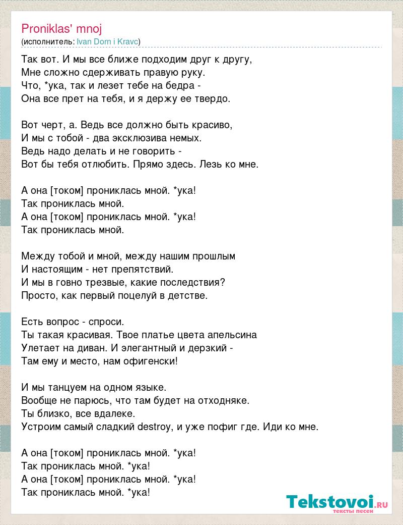 Так вот. И мы все ближе подходим друг к другу, Мне сложно сдерживать правую руку. Что, *ука, так и лезет тебе на бедра - Она все прет на тебя, и я держу ее твердо. Вот черт, а. Ведь все должно быть красиво, И мы с тобой - два эксклюзива немых. Ведь надо делать и не говорить - Вот бы тебя отлюбить. Прямо здесь. Лезь ко мне. А она [током] прониклась мной. *ука! Так прониклась мной. А она [током] прониклась мной. *ука! Так прониклась мной. Между тобой и мной, между нашим прошлым И настоящим - нет препятствий. И мы в говно трезвые, какие последствия? Просто, как первый поцелуй в детстве. Есть вопрос - спроси. Ты такая красивая. Твое платье цвета апельсина Улетает на диван. И элегантный и дерзкий - Там ему и место, нам офигенски! И мы танцуем на одном языке. Вообще не парюсь, что там будет на отходняке. Ты близко, все вдалеке. Устроим самый сладкий destroy, и уже пофиг где. Иди ко мне. А она [током] прониклась мной. *ука! Так прониклась мной. *ука! А она [током] прониклась мной. *ука! Так прониклась мной. *ука!