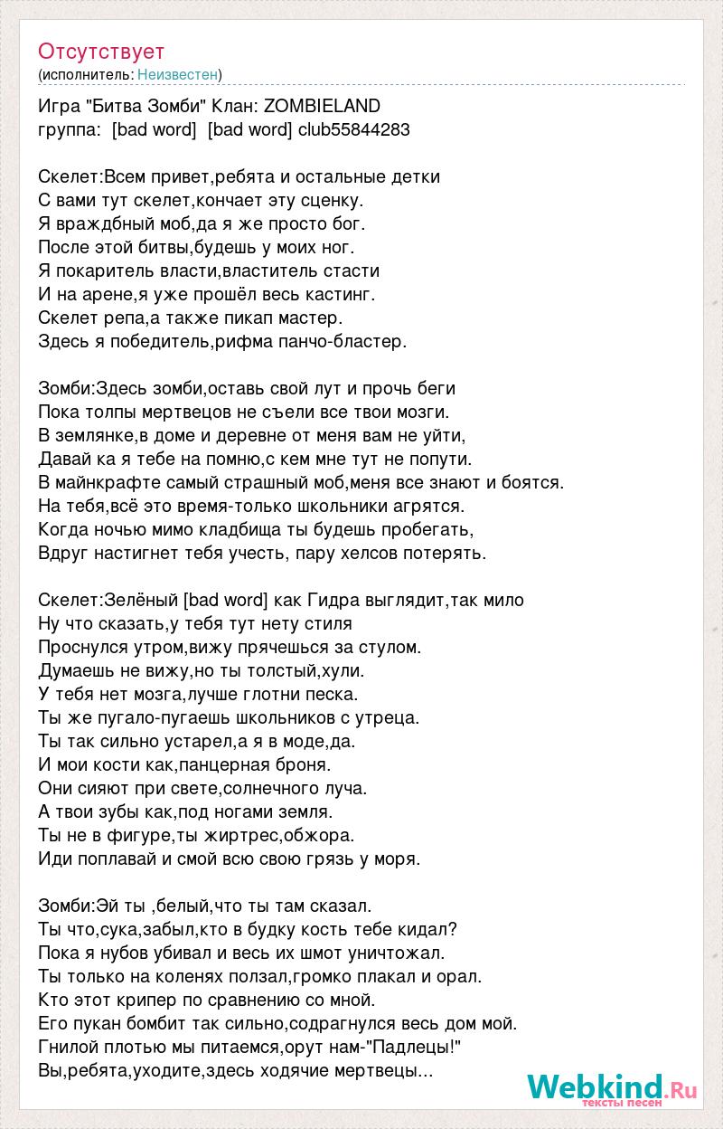 Игра "Битва Зомби" Клан: ZOMBIELAND группа: [bad word] [bad word] club55844283 Скелет:Всем привет,ребята и остальные детки С вами тут скелет,кончает эту сценку. Я враждбный моб,да я же просто бог. После этой битвы,будешь у моих ног. Я покаритель власти,властитель стасти И на арене,я уже прошёл весь кастинг. Скелет репа,а также пикап мастер. Здесь я победитель,рифма панчо-бластер. Зомби:Здесь зомби,оставь свой лут и прочь беги Пока толпы мертвецов не съели все твои мозги. В землянке,в доме и деревне от меня вам не уйти, Давай ка я тебе на помню,с кем мне тут не попути. В майнкрафте самый страшный моб,меня все знают и боятся. На тебя,всё это время-только школьники агрятся. Когда ночью мимо кладбища ты будешь пробегать, Вдруг настигнет тебя учесть, пару хелсов потерять. Скелет:Зелёный [bad word] как Гидра выглядит,так мило Ну что сказать,у тебя тут нету стиля Проснулся утром,вижу прячешься за стулом. Думаешь не вижу,но ты толстый,хули. У тебя нет мозга,лучше глотни песка. Ты же пугало-пугаешь школьников с утреца. Ты так сильно устарел,а я в моде,да. И мои кости как,панцерная броня. Они сияют при свете,солнечного луча. А твои зубы как,под ногами земля. Ты не в фигуре,ты жиртрес,обжора. Иди поплавай и смой всю свою грязь у моря. Зомби:Эй ты ,белый,что ты там сказал. Ты что,сука,забыл,кто в будку кость тебе кидал? Пока я нубов убивал и весь их шмот уничтожал. Ты только на коленях ползал,громко плакал и орал. Кто этот крипер по сравнению со мной. Его пукан бомбит так сильно,содрагнулся весь дом мой. Гнилой плотью мы питаемся,орут нам-"Падлецы!" Вы,ребята,уходите,здесь ходячие мертвецы...
