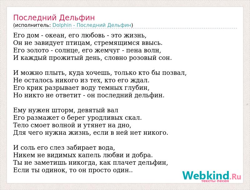 Его дом - океан, его любовь - это жизнь, Он не завидует птицам, стремящимся ввысь. Его золото - солнце, его жемчуг - пена волн, И каждый прожитый день, словно розовый сон. И можно плыть, куда хочешь, только кто бы позвал, Не осталось никого из тех, кто его ждал. Его крик разрывает воду темных глубин, Но никто не ответит - он последний дельфин. Ему нужен шторм, девятый вал Его размажет о берег уродливых скал. Тело смоет волной и утянет на дно, Для чего нужна жизнь, если в ней нет никого. И соль его слез забирает вода, Никем не видимых капель любви и добра. Ты не заметишь никогда, как плачет дельфин, Если ты одинок, то он просто один..