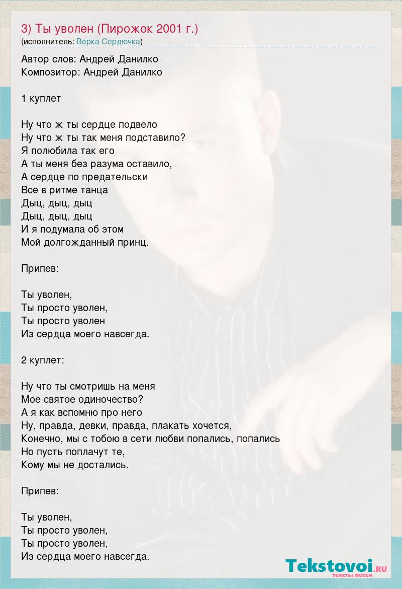 Автор слов: Андрей Данилко Композитор: Андрей Данилко 1 куплет Ну что ж ты сердце подвело Ну что ж ты так меня подставило? Я полюбила так его А ты меня без разума оставило, А сердце по предательски Все в ритме танца Дыц, дыц, дыц Дыц, дыц, дыц И я подумала об этом Мой долгожданный принц. Припев: Ты уволен, Ты просто уволен, Ты просто уволен Из сердца моего навсегда. 2 куплет: Ну что ты смотришь на меня Мое святое одиночество? А я как вспомню про него Ну, правда, девки, правда, плакать хочется, Конечно, мы с тобою в сети любви попались, попались Но пусть поплачут те, Кому мы не достались. Припев: Ты уволен, Ты просто уволен, Ты просто уволен, Из сердца моего навсегда.