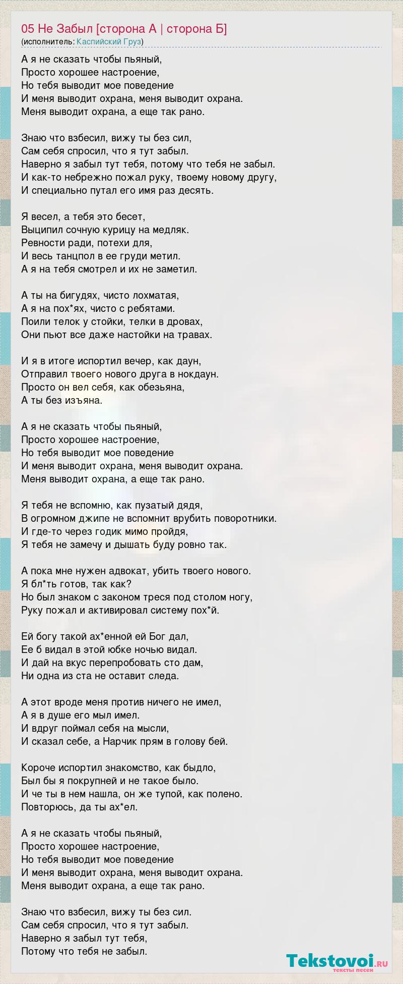А я не сказать чтобы пьяный, Просто хорошее настроение, Но тебя выводит мое поведение И меня выводит охрана, меня выводит охрана. Меня выводит охрана, а еще так рано. Знаю что взбесил, вижу ты без сил, Сам себя спросил, что я тут забыл. Наверно я забыл тут тебя, потому что тебя не забыл. И как-то небрежно пожал руку, твоему новому другу, И специально путал его имя раз десять. Я весел, а тебя это бесет, Выципил сочную курицу на медляк. Ревности ради, потехи для, И весь танцпол в ее груди метил. А я на тебя смотрел и их не заметил. А ты на бигудях, чисто лохматая, А я на пох*ях, чисто с ребятами. Поили телок у стойки, телки в дровах, Они пьют все даже настойки на травах. И я в итоге испортил вечер, как даун, Отправил твоего нового друга в нокдаун. Просто он вел себя, как обезьяна, А ты без изъяна. А я не сказать чтобы пьяный, Просто хорошее настроение, Но тебя выводит мое поведение И меня выводит охрана, меня выводит охрана. Меня выводит охрана, а еще так рано. Я тебя не вспомню, как пузатый дядя, В огромном джипе не вспомнит врубить поворотники. И где-то через годик мимо пройдя, Я тебя не замечу и дышать буду ровно так. А пока мне нужен адвокат, убить твоего нового. Я бл*ть готов, так как? Но был знаком с законом треся под столом ногу, Руку пожал и активировал систему пох*й. Ей богу такой ах*енной ей Бог дал, Ее б видал в этой юбке ночью видал. И дай на вкус перепробовать сто дам, Ни одна из ста не оставит следа. А этот вроде меня против ничего не имел, А я в душе его мыл имел. И вдруг поймал себя на мысли, И сказал себе, а Нарчик прям в голову бей. Короче испортил знакомство, как быдло, Был бы я покрупней и не такое было. И че ты в нем нашла, он же тупой, как полено. Повторюсь, да ты ах*ел. А я не сказать чтобы пьяный, Просто хорошее настроение, Но тебя выводит мое поведение И меня выводит охрана, меня выводит охрана. Меня выводит охрана, а еще так рано. Знаю что взбесил, вижу ты без сил. Сам себя спросил, что я тут забыл. Наверно я забыл тут тебя, Потому что тебя не забыл.