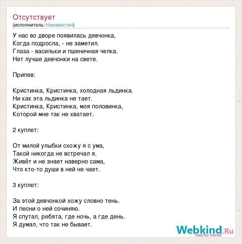 У нас во дворе появилась девчонка, Когда подросла, - не заметил. Глаза - васильки и пшеничная челка. Нет лучше девчонки на свете. Припев: Кристинка, Кристинка, холодная льдинка. Ни как эта льдинка не тает. Кристинка, Кристинка, моя половинка, Которой мне так не хватает. 2 куплет: От милой улыбки схожу я с ума, Такой никогда не встречал я. Живёт и не знает наверно сама, Что кто-то души в ней не чает. 3 куплет: За этой девчонкой хожу словно тень. И песни о ней сочиняю. Я спутал, ребята, где ночь, а где день. Я думал, что так не бывает.