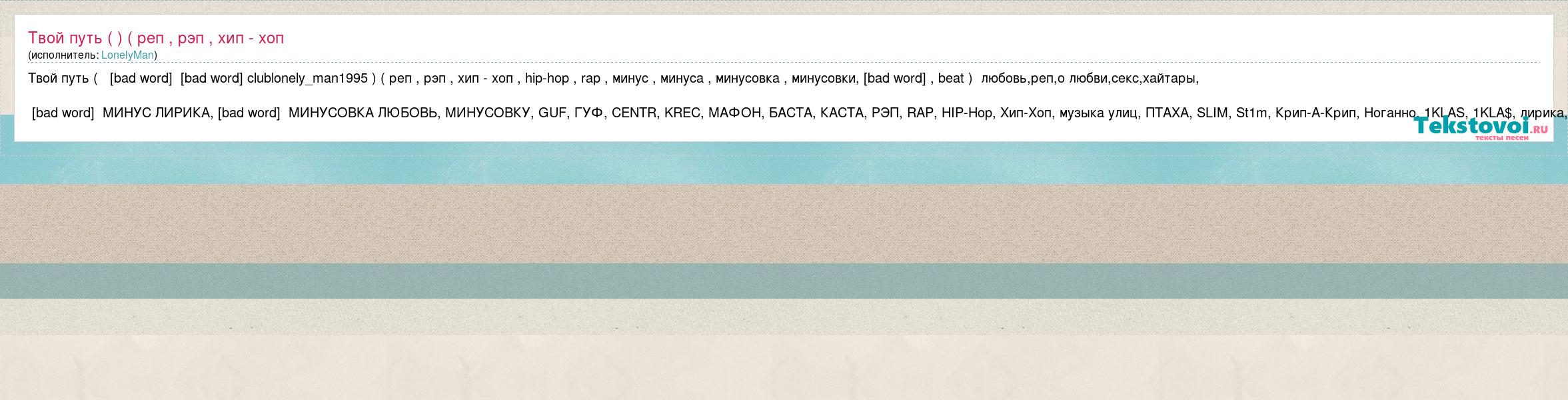 Твой путь ( [bad word] [bad word] clublonely_man1995 ) ( реп , рэп , хип - хоп , hip-hop , rap , минус , минуса , минусовка , минусовки, instrumental , beat ) любовь,реп,о любви,секс,хайтары, (INSTRUMENTALS, МИНУС ЛИРИКА, INSTRUMENTAL, МИНУСОВКА ЛЮБОВЬ, МИНУСОВКУ, GUF, ГУФ, CENTR, KREC, МАФОН, БАСТА, КАСТА, РЭП, RAP, HIP-Hop, Хип-Хоп, музыка улиц, ПТАХА, SLIM, St1m, Крип-А-Крип, Ноганно, 1KLAS, 1KLA$, лирика,