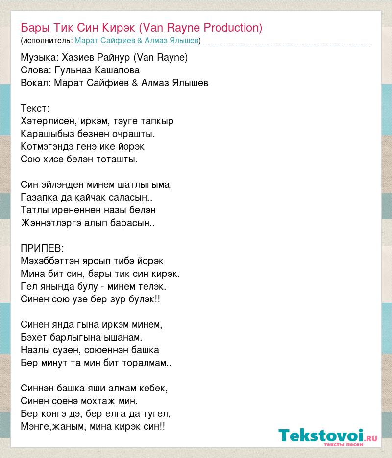 Музыка: Хазиев Райнур (Van Rayne) Слова: Гульназ Кашапова Вокал: Марат Сайфиев & Алмаз Ялышев Текст: Хэтерлисен, иркэм, тэуге тапкыр Карашыбыз безнен очрашты. Котмэгэндэ генэ ике йорэк Сою хисе белэн тоташты. Син эйлэнден минем шатлыгыма, Газапка да кайчак саласын.. Татлы ирененнен назы белэн Жэннэтлэргэ алып барасын.. ПРИПЕВ: Мэхэббэттэн ярсып тибэ йорэк Мина бит син, бары тик син кирэк. Гел янында булу - минем телэк. Синен сою узе бер зур булэк!! Синен янда гына иркэм минем, Бэхет барлыгына ышанам. Назлы сузен, союеннэн башка Бер минут та мин бит торалмам.. Синнэн башка яши алмам кебек, Синен соенэ мохтаж мин. Бер конгэ дэ, бер елга да тугел, Мэнге,жаным, мина кирэк син!!