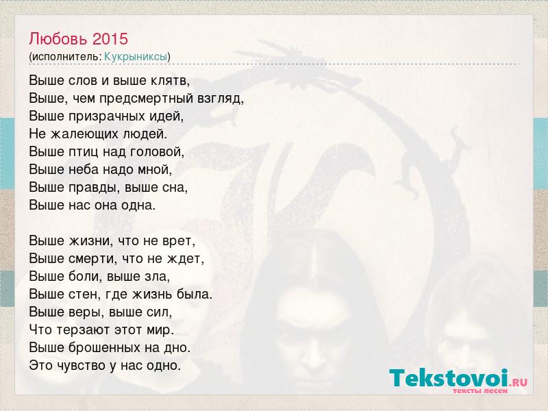 Выше слов и выше клятв, Выше, чем предсмертный взгляд, Выше призрачных идей, Не жалеющих людей. Выше птиц над головой, Выше неба надо мной, Выше правды, выше сна, Выше нас она одна. Выше жизни, что не врет, Выше смерти, что не ждет, Выше боли, выше зла, Выше стен, где жизнь была. Выше веры, выше сил, Что терзают этот мир. Выше брошенных на дно. Это чувство у нас одно.