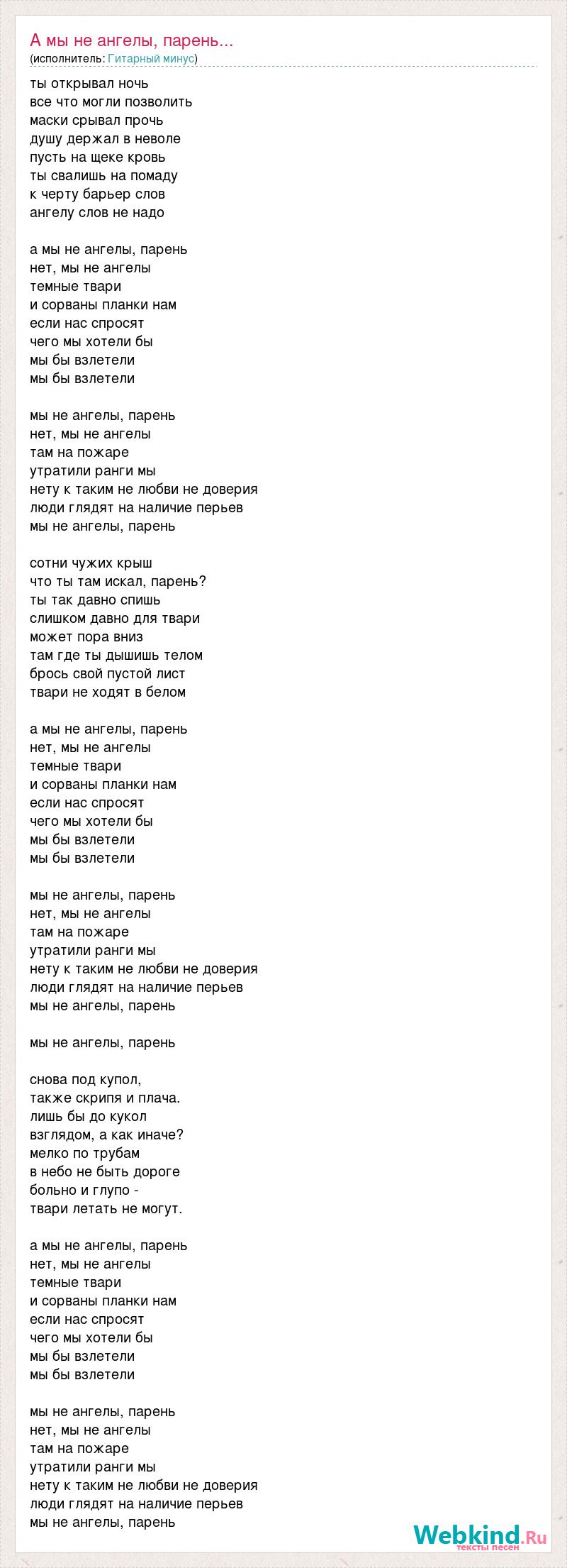 ты открывал ночь все что могли позволить маски срывал прочь душу держал в неволе пусть на щеке кровь ты свалишь на помаду к черту барьер слов ангелу слов не надо а мы не ангелы, парень нет, мы не ангелы темные твари и сорваны планки нам если нас спросят чего мы хотели бы мы бы взлетели мы бы взлетели мы не ангелы, парень нет, мы не ангелы там на пожаре утратили ранги мы нету к таким не любви не доверия люди глядят на наличие перьев мы не ангелы, парень сотни чужих крыш что ты там искал, парень? ты так давно спишь слишком давно для твари может пора вниз там где ты дышишь телом брось свой пустой лист твари не ходят в белом а мы не ангелы, парень нет, мы не ангелы темные твари и сорваны планки нам если нас спросят чего мы хотели бы мы бы взлетели мы бы взлетели мы не ангелы, парень нет, мы не ангелы там на пожаре утратили ранги мы нету к таким не любви не доверия люди глядят на наличие перьев мы не ангелы, парень мы не ангелы, парень снова под купол, также скрипя и плача. лишь бы до кукол взглядом, а как иначе? мелко по трубам в небо не быть дороге больно и глупо - твари летать не могут. а мы не ангелы, парень нет, мы не ангелы темные твари и сорваны планки нам если нас спросят чего мы хотели бы мы бы взлетели мы бы взлетели мы не ангелы, парень нет, мы не ангелы там на пожаре утратили ранги мы нету к таким не любви не доверия люди глядят на наличие перьев мы не ангелы, парень