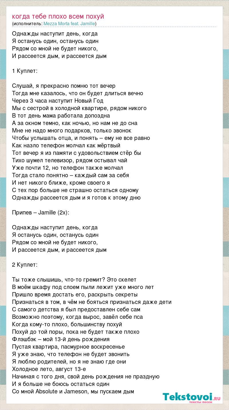 Однажды наступит день, когда Я останусь один, останусь один Рядом со мной не будет никого, И рассеется дым, и рассеется дым 1 Куплет: Слушай, я прекрасно помню тот вечер Тогда мне казалось, что он будет длиться вечно Через 3 часа наступит Новый Год Мы с сестрой в холодной квартире, рядом никого В тот день мама работала допоздна А за окном темно, как ночью, но нам не до сна Мне не надо много подарков, только звонок Чтобы услышать отца, и понять – ему не все равно Как назло телефон молчал как мёртвый Тот вечер я из памяти с удовольствием стёр бы Тихо шумел телевизор, рядом остывал чай Уже почти 12, но телефон также молчал Тогда стало понятно – каждый сам за себя И нет никого ближе, кроме своего я С тех пор больше не страшно остаться одному Однажды рассеется дым и я готов к этому дню Припев – Jamille (2x): Однажды наступит день, когда Я останусь один, останусь один Рядом со мной не будет никого, И рассеется дым, и рассеется дым 2 Куплет: Ты тоже слышишь, что-то гремит? Это скелет В моём шкафу под слоем пыли лежит уже много лет Пришло время достать его, раскрыть секреты Признаться в том, в чём не бояться признаться даже дети С самого детства я был предоставлен себе сам Возможно поэтому, когда вырос, завёл себе пса Когда кому-то плохо, большинству похуй Похуй до той поры, пока не будет также плохо Флэшбэк – мой 13-й день рождения Пустая квартира, пасмурное воскресенье Я уже знаю, что телефон не будет звонить Я люблю родителей, но я не знаю где они Холодное лето, август 13-е Начиная с того дня, свой день рождения не праздную И я больше не боюсь остаться один Со мной Absolute и Jameson, мы пускаем дым