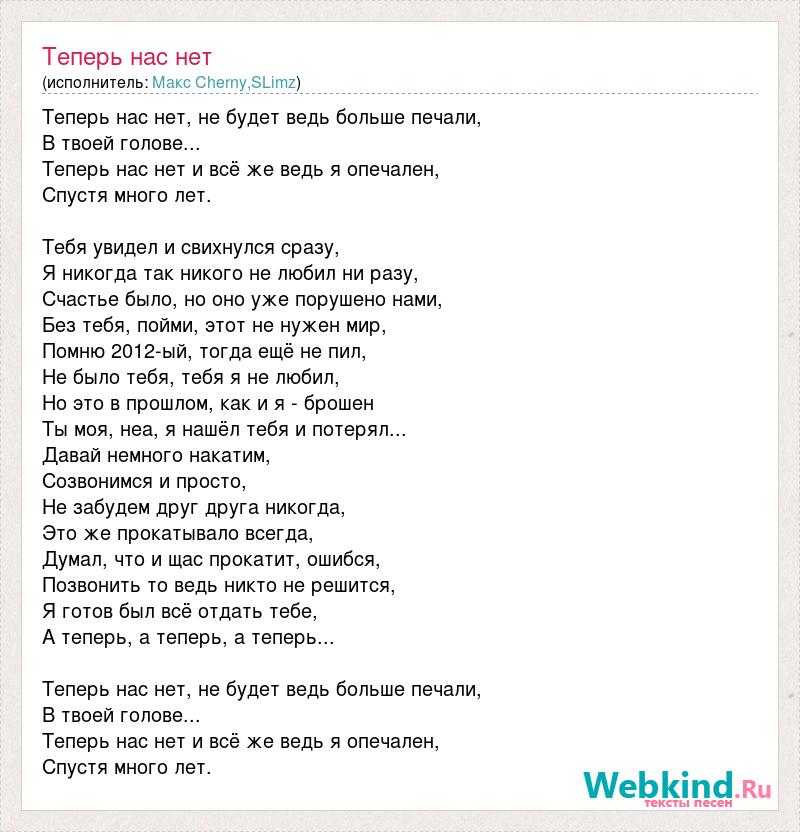 Теперь нас нет, не будет ведь больше печали, В твоей голове... Теперь нас нет и всё же ведь я опечален, Спустя много лет. Тебя увидел и свихнулся сразу, Я никогда так никого не любил ни разу, Счастье было, но оно уже порушено нами, Без тебя, пойми, этот не нужен мир, Помню 2012-ый, тогда ещё не пил, Не было тебя, тебя я не любил, Но это в прошлом, как и я - брошен Ты моя, неа, я нашёл тебя и потерял... Давай немного накатим, Созвонимся и просто, Не забудем друг друга никогда, Это же прокатывало всегда, Думал, что и щас прокатит, ошибся, Позвонить то ведь никто не решится, Я готов был всё отдать тебе, А теперь, а теперь, а теперь... Теперь нас нет, не будет ведь больше печали, В твоей голове... Теперь нас нет и всё же ведь я опечален, Спустя много лет.