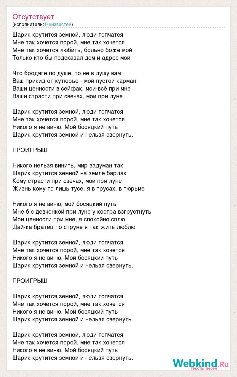 Шарик крутится земной, люди топчатся Мне так хочется порой, мне так хочется Мне так хочется любить, больно боже мой Только кто-бы подсказал дом и адрес мой Что бродяге по душе, то не в душу вам Ваш прикид от кутюрье - мой пустой карман Ваши ценности в сейфак, мои-всё при мне Ваши страсти при свечах, мои при луне. Шарик крутится земной, люди топчатся Мне так хочется порой, мне так хочется Никого я не виню. Мой босяцкий путь Шарик крутится земной и нельзя свернуть. ПРОИГРЫШ Никого нельзя винить, мир задуман так Шарик крутится земной на земле бардак Кому страсти при свечах, мои при луне Жизнь кому то лишь тусе, я в трусах, в тюрьме Никого я не виню, мой босяцкий путь Мне б с девчонкой при луне у костра взгрустнуть Мои ценности при мне, я спокойно сплю Дай-ка братец по струне я так жить люблю Шарик крутится земной, люди топчатся Мне так хочется порой, мне так хочется Никого я не виню. Мой босяцкий путь Шарик крутится земной и нельзя свернуть. ПРОИГРЫШ Шарик крутится земной, люди топчатся Мне так хочется порой, мне так хочется Никого я не виню. Мой босяцкий путь Шарик крутится земной и нельзя свернуть. Шарик крутится земной, люди топчатся Мне так хочется порой, мне так хочется Никого я не виню. Мой босяцкий путь Шарик крутится земной и нельзя свернуть.
