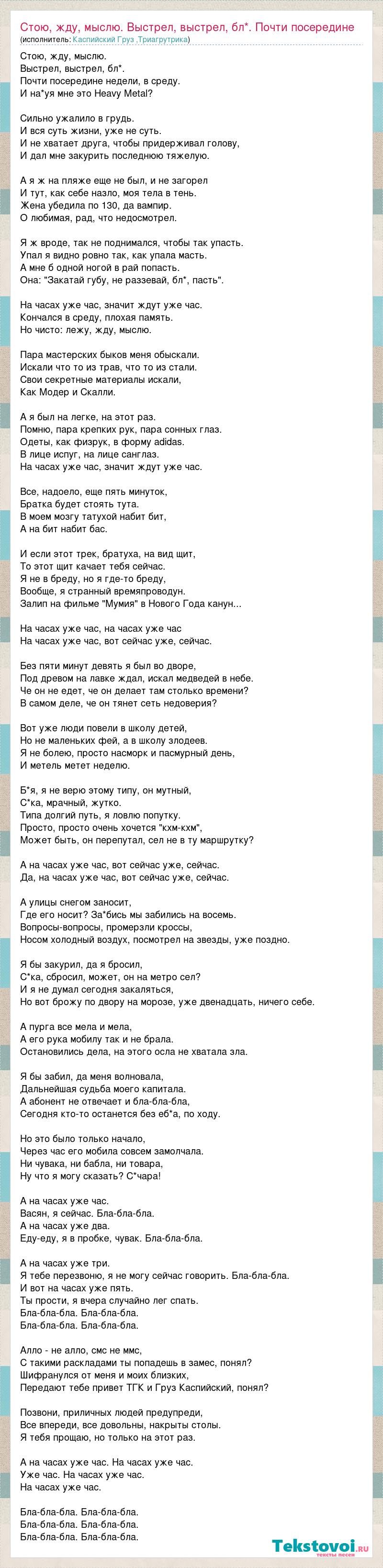 Главная→Исполнители→Каспийский Груз ,Триагрутрика→Стою, жду, мыслю. Выстрел, выстрел, бл*. Почти посередине недели, в среду. И на