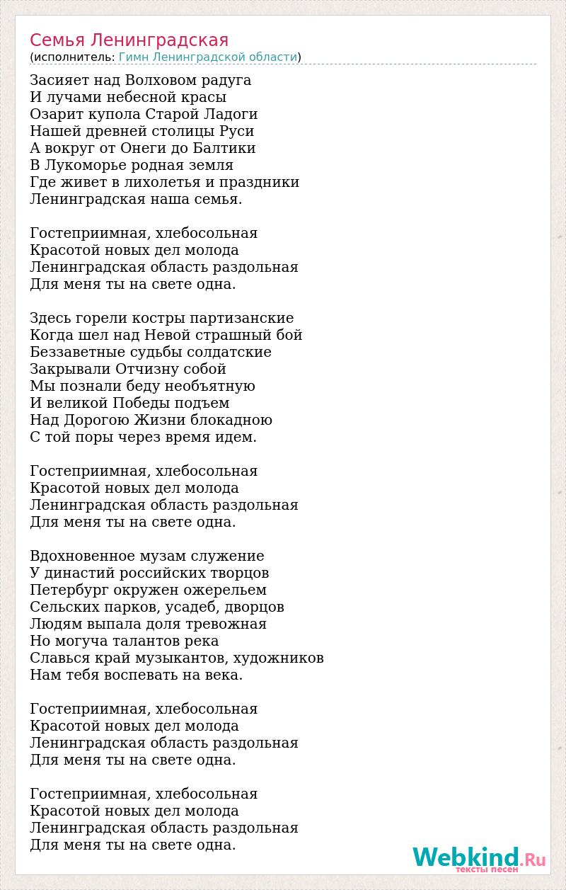 Засияет над Волховом радуга И лучами небесной красы Озарит купола Старой Ладоги Нашей древней столицы Руси А вокруг от Онеги до Балтики В Лукоморье родная земля Где живет в лихолетья и праздники Ленинградская наша семья. Гостеприимная, хлебосольная Красотой новых дел молода Ленинградская область раздольная Для меня ты на свете одна. Здесь горели костры партизанские Когда шел над Невой страшный бой Беззаветные судьбы солдатские Закрывали Отчизну собой Мы познали беду необъятную И великой Победы подъем Над Дорогою Жизни блокадною С той поры через время идем. Гостеприимная, хлебосольная Красотой новых дел молода Ленинградская область раздольная Для меня ты на свете одна. Вдохновенное музам служение У династий российских творцов Петербург окружен ожерельем Сельских парков, усадеб, дворцов Людям выпала доля тревожная Но могуча талантов река Славься край музыкантов, художников Нам тебя воспевать на века. Гостеприимная, хлебосольная Красотой новых дел молода Ленинградская область раздольная Для меня ты на свете одна. Гостеприимная, хлебосольная Красотой новых дел молода Ленинградская область раздольная Для меня ты на свете одна.