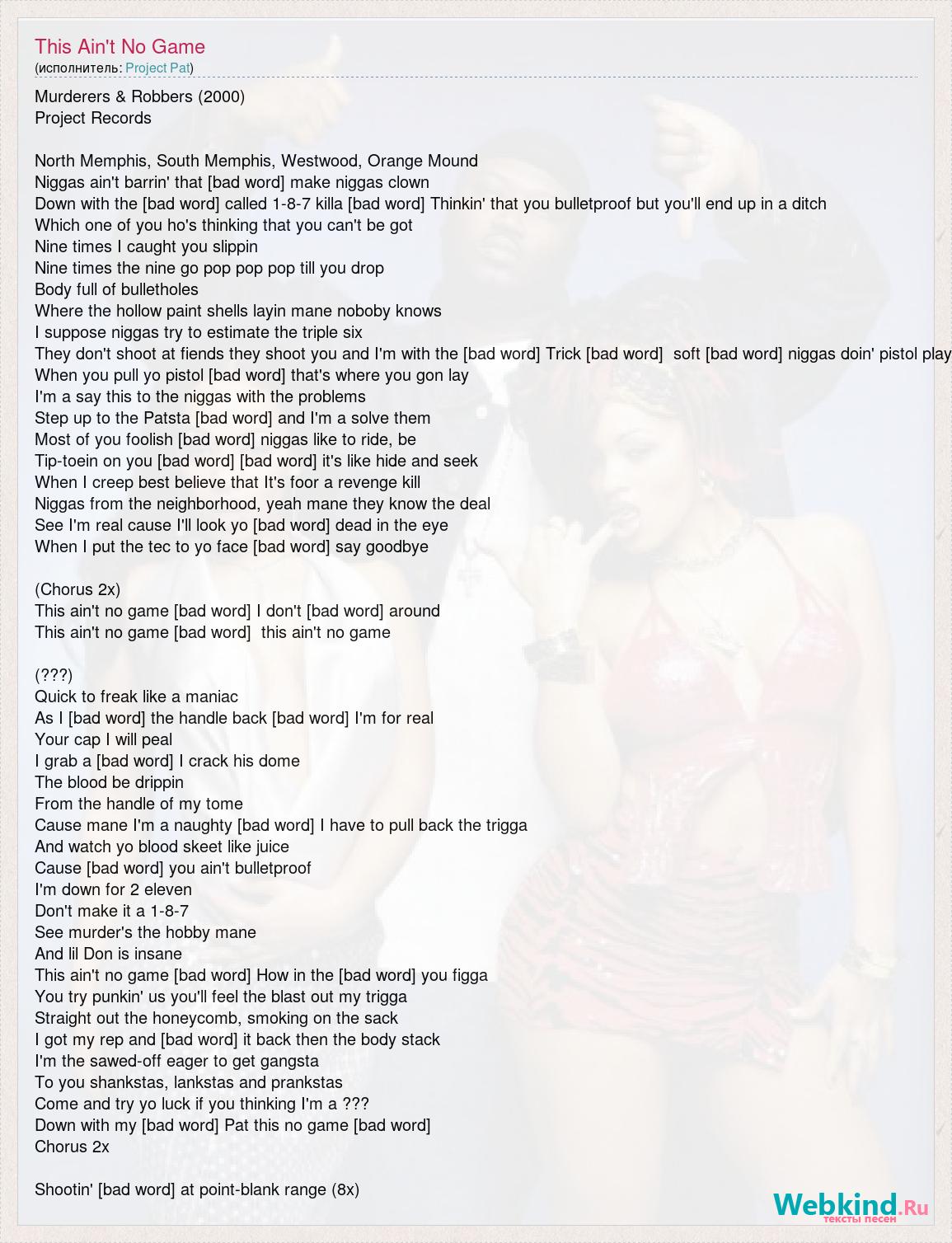 Murderers & Robbers (2000) Project Records North Memphis, South Memphis, Westwood, Orange Mound Niggas ain't barrin' that [bad word] make niggas clown Down with the [bad word] called 1-8-7 killa [bad word] Thinkin' that you bulletproof but you'll end up in a ditch Which one of you ho's thinking that you can't be got Nine times I caught you slippin Nine times the nine go pop pop pop till you drop Body full of bulletholes Where the hollow paint shells layin mane noboby knows I suppose niggas try to estimate the triple six They don't shoot at fiends they shoot you and I'm with the [bad word] Trick [bad word] soft [bad word] niggas doin' pistol play When you pull yo pistol [bad word] that's where you gon lay I'm a say this to the niggas with the problems Step up to the Patsta [bad word] and I'm a solve them Most of you foolish [bad word] niggas like to ride, be Tip-toein on you [bad word] [bad word] it's like hide and seek When I creep best believe that It's foor a revenge kill Niggas from the neighborhood, yeah mane they know the deal See I'm real cause I'll look yo [bad word] dead in the eye When I put the tec to yo face [bad word] say goodbye (Chorus 2x) This ain't no game [bad word] I don't [bad word] around This ain't no game [bad word] this ain't no game (???) Quick to freak like a maniac As I [bad word] the handle back [bad word] I'm for real Your cap I will peal I grab a [bad word] I crack his dome The blood be drippin From the handle of my tome Cause mane I'm a naughty [bad word] I have to pull back the trigga And watch yo blood skeet like juice Cause [bad word] you ain't bulletproof I'm down for 2 eleven Don't make it a 1-8-7 See murder's the hobby mane And lil Don is insane This ain't no game [bad word] How in the [bad word] you figga You try punkin' us you'll feel the blast out my trigga Straight out the honeycomb, smoking on the sack I got my rep and [bad word] it back then the body stack I'm the sawed-off eager to get gangsta To you shankstas, lankstas and prankstas Come and try yo luck if you thinking I'm a ??? Down with my [bad word] Pat this no game [bad word] Chorus 2x Shootin' [bad word] at point-blank range (8x)