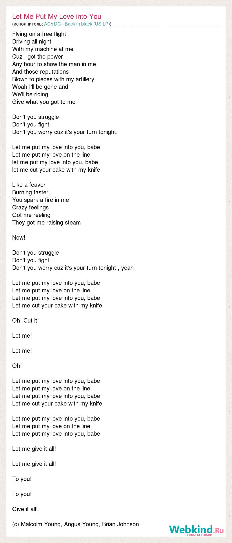 Flying on a free flight Driving all night With my machine at me Cuz I got the power Any hour to show the man in me And those reputations Blown to pieces with my artillery Woah I'll be gone and We'll be riding Give what you got to me Don't you struggle Don't you fight Don't you worry cuz it's your turn tonight. Let me put my love into you, babe Let me put my love on the line let me put my love into you, babe let me cut your cake with my knife Like a feaver Burning faster You spark a fire in me Crazy feelings Got me reeling They got me raising steam Now! Don't you struggle Don't you fight Don't you worry cuz it's your turn tonight , yeah Let me put my love into you, babe Let me put my love on the line Let me put my love into you, babe Let me cut your cake with my knife Oh! Cut it! Let me! Let me! Oh! Let me put my love into you, babe Let me put my love on the line Let me put my love into you, babe Let me cut your cake with my knife Let me put my love into you, babe Let me put my love on the line Let me put my love into you, babe Let me give it all! Let me give it all! To you! To you! Give it all! (с) Malcolm Young, Angus Young, Brian Johnson