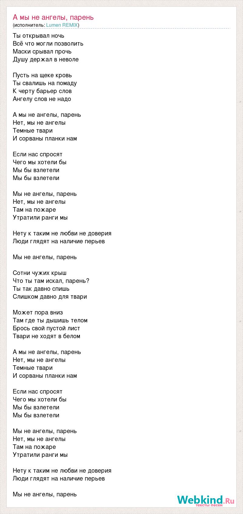 Ты открывал ночь Всё что могли позволить Маски срывал прочь Душу держал в неволе Пусть на щеке кровь Ты свалишь на помаду К черту барьер слов Ангелу слов не надо А мы не ангелы, парень Нет, мы не ангелы Темные твари И сорваны планки нам Если нас спросят Чего мы хотели бы Мы бы взлетели Мы бы взлетели Мы не ангелы, парень Нет, мы не ангелы Там на пожаре Утратили ранги мы Нету к таким не любви не доверия Люди глядят на наличие перьев Мы не ангелы, парень Сотни чужих крыш Что ты там искал, парень? Ты так давно спишь Слишком давно для твари Может пора вниз Там где ты дышишь телом Брось свой пустой лист Твари не ходят в белом А мы не ангелы, парень Нет, мы не ангелы Темные твари И сорваны планки нам Если нас спросят Чего мы хотели бы Мы бы взлетели Мы бы взлетели Мы не ангелы, парень Нет, мы не ангелы Там на пожаре Утратили ранги мы Нету к таким не любви не доверия Люди глядят на наличие перьев Мы не ангелы, парень