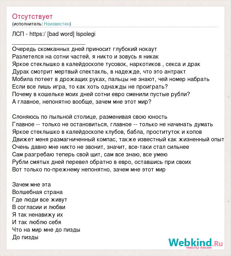ЛСП - https:/ [bad word] lspolegi _______________________ Очередь скомканных дней приносит глубокий нокаут Разлетелся на сотни частей, я никто и зовусь я никак Яркое стеклышко в калейдоскопе тусовок, наркотиков , секса и драк Дурак смотрит мертвый спектакль, в надежде, что это антракт Мобила потеет в дрожащих руках, пальцы не знают, чей номер набрать Если все лишь игра, то как хоть однажды не проиграть? Почему в кошельке моих дней сотни евро сменили пустые рубли? А главное, непонятно вообще, зачем мне этот мир? Слоняюсь по пыльной столице, разменивая свою юность Главное -- только не остановиться, главное -- только не начинать думать Яркое стеклышко в калейдоскопе клубов, бабла, проституток и копов Движет меня размагниченный компас, также известный как жизненный опыт Очень давно мне никто не звонит, значит, все-таки стал сильнее Сам разгребаю теперь свой щит, сам все знаю, все умею Рубли смятых дней перевел обратно в евро, оставшись при своих Вот только по-прежнему непонятно, зачем мне этот мир Зачем мне эта Волшебная страна Где люди все живут В согласии и любви Я так ненавижу их И так люблю себя Что на мир мне до пизды До пизды