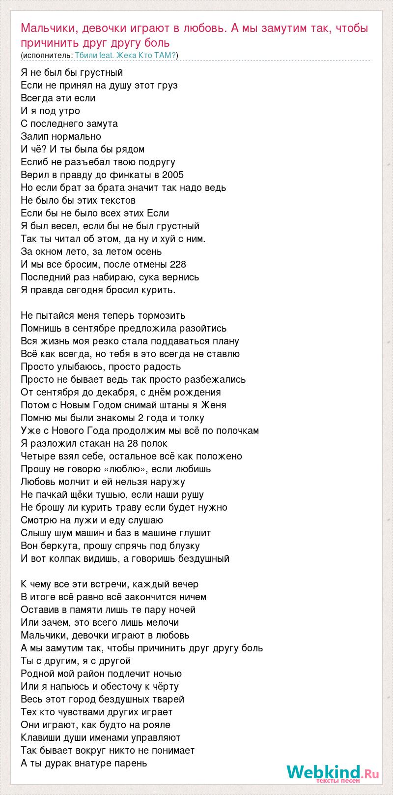 Главная→Исполнители→Тбили feat. Жека Кто ТАМ?→Мальчики, девочки играют в любовь. А мы замутим так, чтобы причинить д