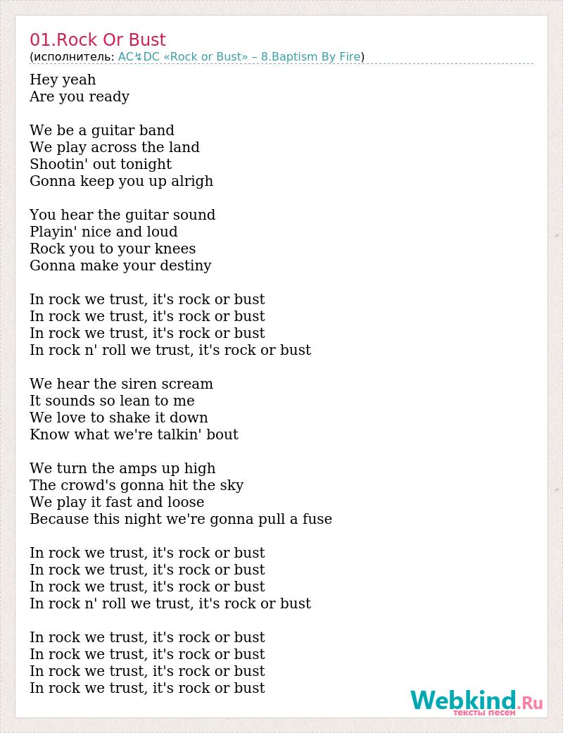 Hey yeah Are you ready We be a guitar band We play across the land Shootin' out tonight Gonna keep you up alrigh You hear the guitar sound Playin' nice and loud Rock you to your knees Gonna make your destiny In rock we trust, it's rock or bust In rock we trust, it's rock or bust In rock we trust, it's rock or bust In rock n' roll we trust, it's rock or bust We hear the siren scream It sounds so lean to me We love to shake it down Know what we're talkin' bout We turn the amps up high The crowd's gonna hit the sky We play it fast and loose Because this night we're gonna pull a fuse In rock we trust, it's rock or bust In rock we trust, it's rock or bust In rock we trust, it's rock or bust In rock n' roll we trust, it's rock or bust In rock we trust, it's rock or bust In rock we trust, it's rock or bust In rock we trust, it's rock or bust In rock we trust, it's rock or bust