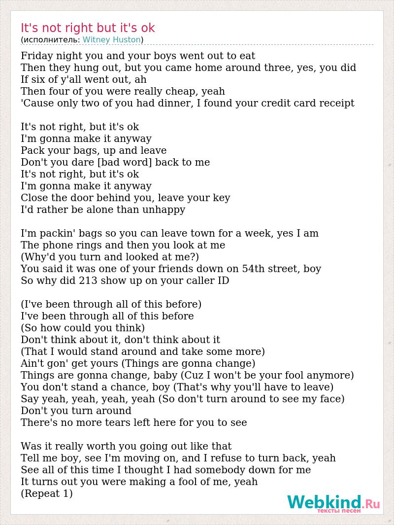 Friday night you and your boys went out to eat Then they hung out, but you came home around three, yes, you did If six of y'all went out, ah Then four of you were really cheap, yeah 'Cause only two of you had dinner, I found your credit card receipt It's not right, but it's ok I'm gonna make it anyway Pack your bags, up and leave Don't you dare [bad word] back to me It's not right, but it's ok I'm gonna make it anyway Close the door behind you, leave your key I'd rather be alone than unhappy I'm packin' bags so you can leave town for a week, yes I am The phone rings and then you look at me (Why'd you turn and looked at me?) You said it was one of your friends down on 54th street, boy So why did 213 show up on your caller ID (I've been through all of this before) I've been through all of this before (So how could you think) Don't think about it, don't think about it (That I would stand around and take some more) Ain't gon' get yours (Things are gonna change) Things are gonna change, baby (Cuz I won't be your fool anymore) You don't stand a chance, boy (That's why you'll have to leave) Say yeah, yeah, yeah, yeah (So don't turn around to see my face) Don't you turn around There's no more tears left here for you to see Was it really worth you going out like that Tell me boy, see I'm moving on, and I refuse to turn back, yeah See all of this time I thought I had somebody down for me It turns out you were making a fool of me, yeah (Repeat 1)