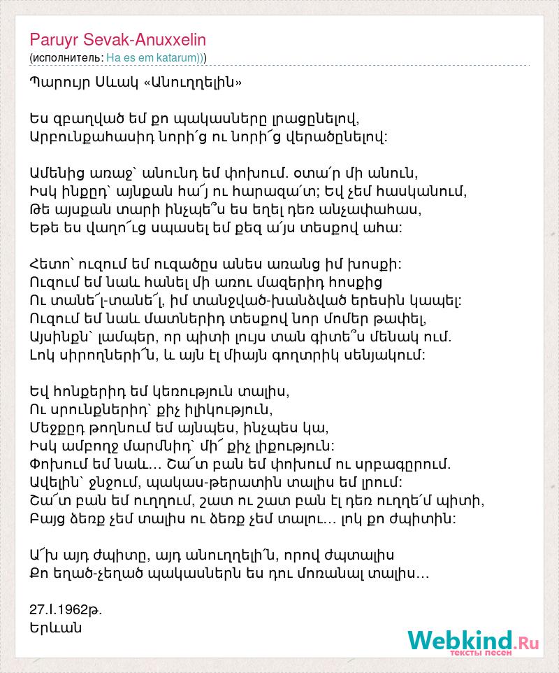 А как ты думаешь, о чем песня "Paruyr Sevak-Anuxxelin" ?