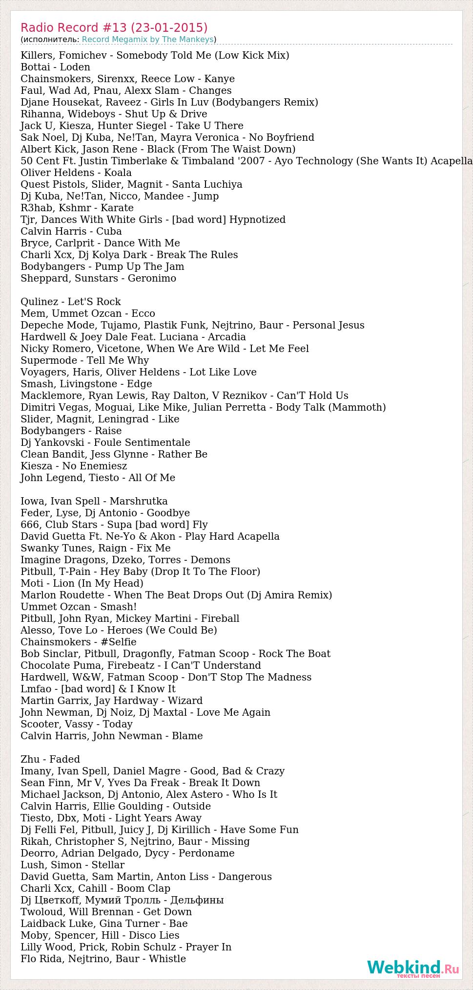 Killers, Fomichev - Somebody Told Me (Low Kick Mix) Bottai - Loden Chainsmokers, Sirenxx, Reece Low - Kanye Faul, Wad Ad, Pnau, Alexx Slam - Changes Djane Housekat, Raveez - Girls In Luv (Bodybangers Remix) Rihanna, Wideboys - Shut Up & Drive Jack U, Kiesza, Hunter Siegel - Take U There Sak Noel, Dj Kuba, Ne!Tan, Mayra Veronica - No Boyfriend Albert Kick, Jason Rene - Black (From The Waist Down) 50 Cent Ft. Justin Timberlake & Timbaland '2007 - Ayo Technology (She Wants It) Acapella Oliver Heldens - Koala Quest Pistols, Slider, Magnit - Santa Luchiya Dj Kuba, Ne!Tan, Nicco, Mandee - Jump R3hab, Kshmr - Karate Tjr, Dances With White Girls - [bad word] Hypnotized Calvin Harris - Cuba Bryce, Carlprit - Dance With Me Charli Xcx, Dj Kolya Dark - Break The Rules Bodybangers - Pump Up The Jam Sheppard, Sunstars - Geronimo Qulinez - Let'S Rock Mem, Ummet Ozcan - Ecco Depeche Mode, Tujamo, Plastik Funk, Nejtrino, Baur - Personal Jesus Hardwell & Joey Dale Feat. Luciana - Arcadia Nicky Romero, Vicetone, When We Are Wild - Let Me Feel Supermode - Tell Me Why Voyagers, Haris, Oliver Heldens - Lot Like Love Smash, Livingstone - Edge Macklemore, Ryan Lewis, Ray Dalton, V Reznikov - Can'T Hold Us Dimitri Vegas, Moguai, Like Mike, Julian Perretta - Body Talk (Mammoth) Slider, Magnit, Leningrad - Like Bodybangers - Raise Dj Yankovski - Foule Sentimentale Clean Bandit, Jess Glynne - Rather Be Kiesza - No Enemiesz John Legend, Tiesto - All Of Me Iowa, Ivan Spell - Marshrutka Feder, Lyse, Dj Antonio - Goodbye 666, Club Stars - Supa [bad word] Fly David Guetta Ft. Ne-Yo & Akon - Play Hard Acapella Swanky Tunes, Raign - Fix Me Imagine Dragons, Dzeko, Torres - Demons Pitbull, T-Pain - Hey Baby (Drop It To The Floor) Moti - Lion (In My Head) Marlon Roudette - When The Beat Drops Out (Dj Amira Remix) Ummet Ozcan - Smash! Pitbull, John Ryan, Mickey Martini - Fireball Alesso, Tove Lo - Heroes (We Could Be) Chainsmokers - #Selfie Bob Sinclar, Pitbull, Dragonfly, Fatman Scoop - Rock The Boat Chocolate Puma, Firebeatz - I Can'T Understand Hardwell, W&W, Fatman Scoop - Don'T Stop The Madness Lmfao - [bad word] & I Know It Martin Garrix, Jay Hardway - Wizard John Newman, Dj Noiz, Dj Maxtal - Love Me Again Scooter, Vassy - Today Calvin Harris, John Newman - Blame Zhu - Faded Imany, Ivan Spell, Daniel Magre - Good, Bad & Crazy Sean Finn, Mr V, Yves Da Freak - Break It Down Michael Jackson, Dj Antonio, Alex Astero - Who Is It Calvin Harris, Ellie Goulding - Outside Tiesto, Dbx, Moti - Light Years Away Dj Felli Fel, Pitbull, Juicy J, Dj Kirillich - Have Some Fun Rikah, Christopher S, Nejtrino, Baur - Missing Deorro, Adrian Delgado, Dycy - Perdoname Lush, Simon - Stellar David Guetta, Sam Martin, Anton Liss - Dangerous Charli Xcx, Cahill - Boom Clap Dj Цветкоff, Мумий Тролль - Дельфины Twoloud, Will Brennan - Get Down Laidback Luke, Gina Turner - Bae Moby, Spencer, Hill - Disco Lies Lilly Wood, Prick, Robin Schulz - Prayer In Flo Rida, Nejtrino, Baur - Whistle