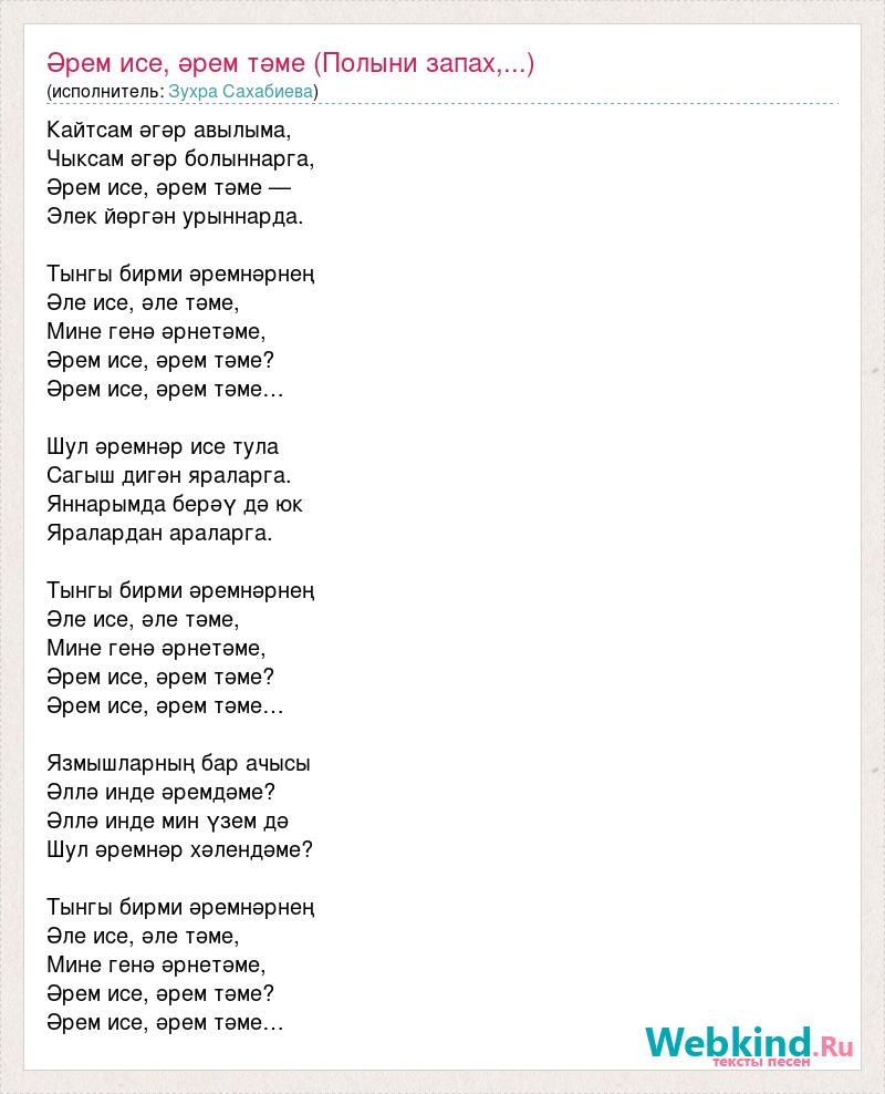 Кайтсам әгәр авылыма, Чыксам әгәр болыннарга, Әрем исе, әрем тәме — Элек йөргән урыннарда. Тынгы бирми әремнәрнең Әле исе, әле тәме, Мине генә әрнетәме, Әрем исе, әрем тәме? Әрем исе, әрем тәме… Шул әремнәр исе тула Сагыш дигән яраларга. Яннарымда берәү дә юк Яралардан араларга. Тынгы бирми әремнәрнең Әле исе, әле тәме, Мине генә әрнетәме, Әрем исе, әрем тәме? Әрем исе, әрем тәме… Язмышларның бар ачысы Әллә инде әремдәме? Әллә инде мин үзем дә Шул әремнәр хәлендәме? Тынгы бирми әремнәрнең Әле исе, әле тәме, Мине генә әрнетәме, Әрем исе, әрем тәме? Әрем исе, әрем тәме…