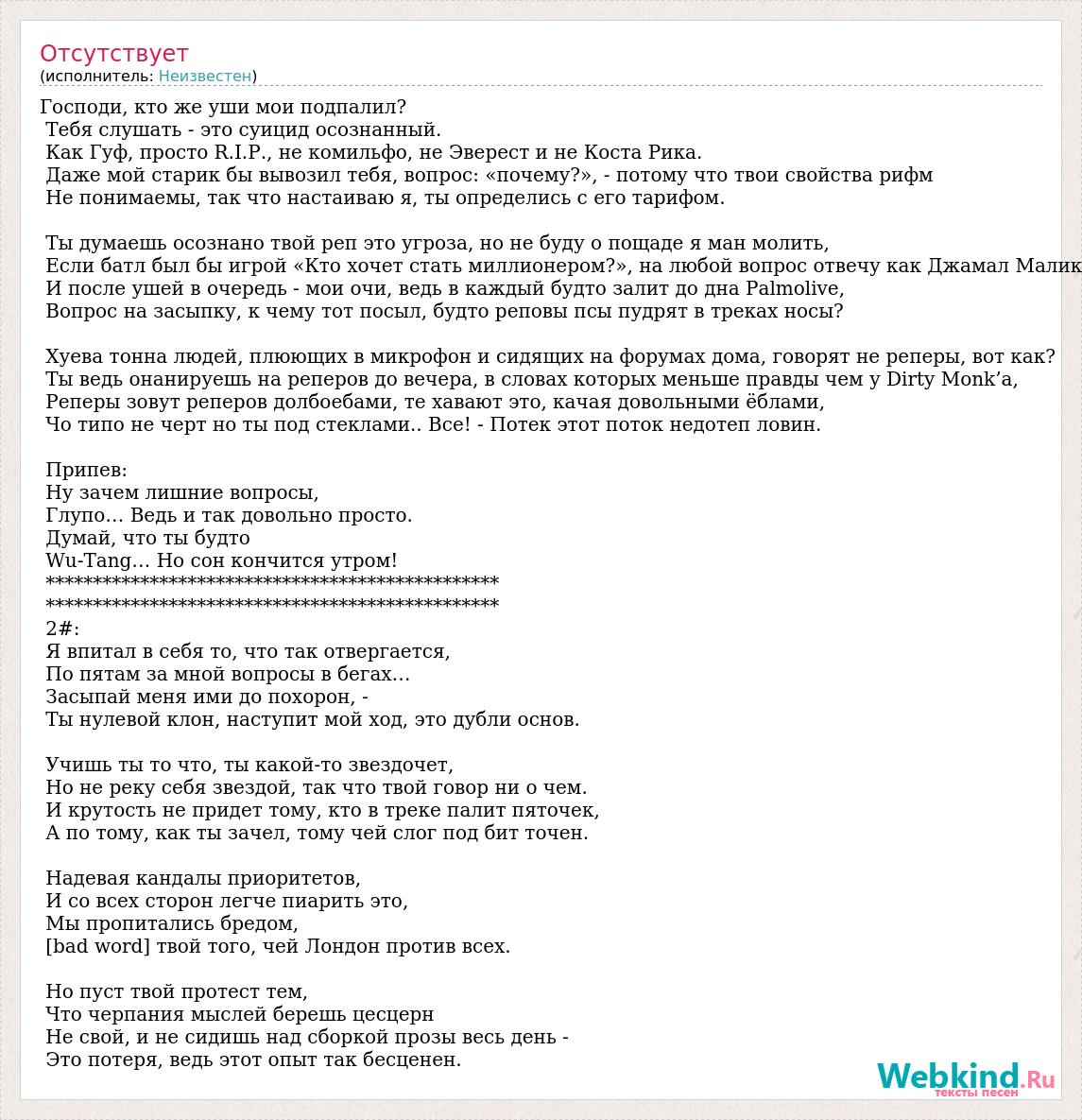 Господи, кто же уши мои подпалил? Тебя слушать - это суицид осознанный. Как Гуф, просто R.I.P., не комильфо, не Эверест и не Коста Рика. Даже мой старик бы вывозил тебя, вопрос: «почему?», - потому что твои свойства рифм Не понимаемы, так что настаиваю я, ты определись с его тарифом. Ты думаешь осознано твой реп это угроза, но не буду о пощаде я ман молить, Если батл был бы игрой «Кто хочет стать миллионером?», на любой вопрос отвечу как Джамал Малик И после ушей в очередь - мои очи, ведь в каждый будто залит до дна Palmolive, Вопрос на засыпку, к чему тот посыл, будто реповы псы пудрят в треках носы? Хуева тонна людей, плюющих в микрофон и сидящих на форумах дома, говорят не реперы, вот как? Ты ведь онанируешь на реперов до вечера, в словах которых меньше правды чем у Dirty Monk’a, Реперы зовут реперов долбоебами, те хавают это, качая довольными ёблами, Чо типо не черт но ты под стеклами.. Все! - Потек этот поток недотеп ловин. Припев: Ну зачем лишние вопросы, Глупо… Ведь и так довольно просто. Думай, что ты будто Wu-Tang… Но сон кончится утром! ************************************************ ************************************************ 2#: Я впитал в себя то, что так отвергается, По пятам за мной вопросы в бегах… Засыпай меня ими до похорон, - Ты нулевой клон, наступит мой ход, это дубли основ. Учишь ты то что, ты какой-то звездочет, Но не реку себя звездой, так что твой говор ни о чем. И крутость не придет тому, кто в треке палит пяточек, А по тому, как ты зачел, тому чей слог под бит точен. Надевая кандалы приоритетов, И со всех сторон легче пиарить это, Мы пропитались бредом, [bad word] твой того, чей Лондон против всех. Но пуст твой протест тем, Что черпания мыслей берешь цесцерн Не свой, и не сидишь над сборкой прозы весь день - Это потеря, ведь этот опыт так бесценен.