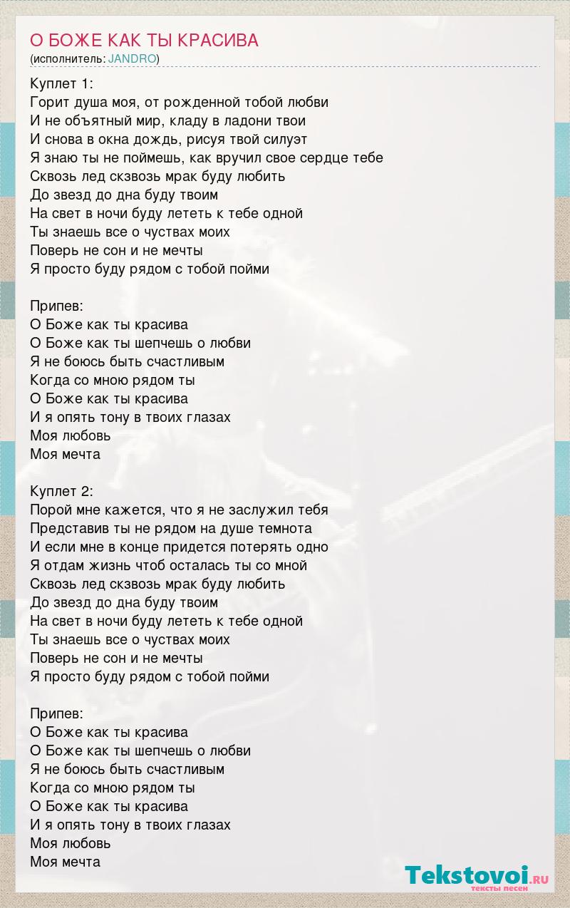 Куплет 1: Горит душа моя, от рожденной тобой любви И не объятный мир, кладу в ладони твои И снова в окна дождь, рисуя твой силуэт Я знаю ты не поймешь, как вручил свое сердце тебе Сквозь лед скзвозь мрак буду любить До звезд до дна буду твоим На свет в ночи буду лететь к тебе одной Ты знаешь все о чуствах моих Поверь не сон и не мечты Я просто буду рядом с тобой пойми Припев: О Боже как ты красива О Боже как ты шепчешь о любви Я не боюсь быть счастливым Когда со мною рядом ты О Боже как ты красива И я опять тону в твоих глазах Моя любовь Моя мечта Куплет 2: Порой мне кажется, что я не заслужил тебя Представив ты не рядом на душе темнота И если мне в конце придется потерять одно Я отдам жизнь чтоб осталась ты со мной Сквозь лед скзвозь мрак буду любить До звезд до дна буду твоим На свет в ночи буду лететь к тебе одной Ты знаешь все о чуствах моих Поверь не сон и не мечты Я просто буду рядом с тобой пойми Припев: О Боже как ты красива О Боже как ты шепчешь о любви Я не боюсь быть счастливым Когда со мною рядом ты О Боже как ты красива И я опять тону в твоих глазах Моя любовь Моя мечта