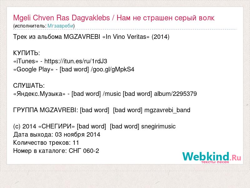 Трек из альбома MGZAVREBI «In Vino Veritas» (2014) КУПИТЬ: «iTunes» - https://itun.es/ru/1rdJ3 «Google Play» - [bad word] /goo.gl/gMpkS4 СЛУШАТЬ: «Яндекс.Музыка» - [bad word] /music [bad word] album/2295379 ГРУППА MGZAVREBI: [bad word] [bad word] mgzavrebi_band (c) 2014 «СНЕГИРИ» [bad word] [bad word] snegirimusic Дата выхода: 03 ноября 2014 Количество треков: 11 Номер в каталоге: СНГ 060-2