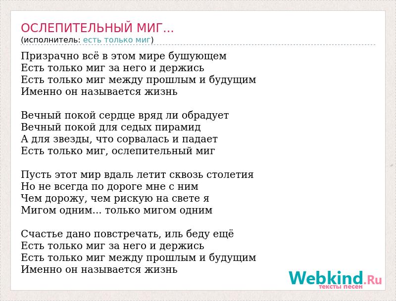 Призрачно всё в этом мире бушующем Есть только миг за него и держись Есть только миг между прошлым и будущим Именно он называется жизнь Вечный покой сердце вряд ли обрадует Вечный покой для седых пирамид А для звезды, что сорвалась и падает Есть только миг, ослепительный миг Пусть этот мир вдаль летит сквозь столетия Но не всегда по дороге мне с ним Чем дорожу, чем рискую на свете я Мигом одним... только мигом одним Счастье дано повстречать, иль беду ещё Есть только миг за него и держись Есть только миг между прошлым и будущим Именно он называется жизнь