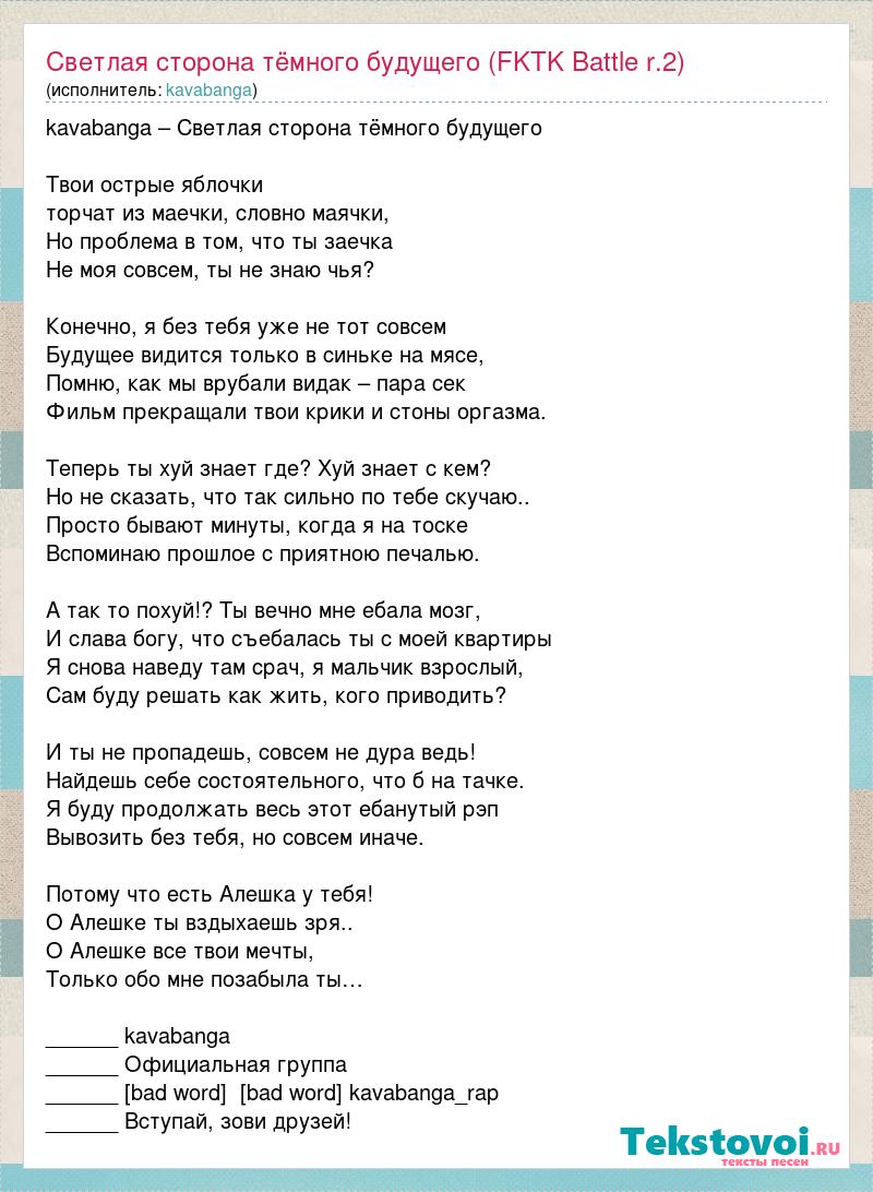 kavabanga – Светлая сторона тёмного будущего Твои острые яблочки торчат из маечки, словно маячки, Но проблема в том, что ты заечка Не моя совсем, ты не знаю чья? Конечно, я без тебя уже не тот совсем Будущее видится только в синьке на мясе, Помню, как мы врубали видак – пара сек Фильм прекращали твои крики и стоны оргазма. Теперь ты хуй знает где? Хуй знает с кем? Но не сказать, что так сильно по тебе скучаю.. Просто бывают минуты, когда я на тоске Вспоминаю прошлое с приятною печалью. А так то похуй!? Ты вечно мне ебала мозг, И слава богу, что съебалась ты с моей квартиры Я снова наведу там срач, я мальчик взрослый, Сам буду решать как жить, кого приводить? И ты не пропадешь, совсем не дура ведь! Найдешь себе состоятельного, что б на тачке. Я буду продолжать весь этот ебанутый рэп Вывозить без тебя, но совсем иначе. Потому что есть Алешка у тебя! О Алешке ты вздыхаешь зря.. О Алешке все твои мечты, Только обо мне позабыла ты… ______ kavabanga ______ Официальная группа ______ [bad word] [bad word] kavabanga_rap ______ Вступай, зови друзей!