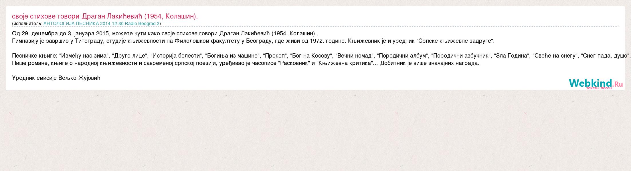 Главная→Исполнители→АНТОЛОГИЈА ПЕСНИКА 2014-12-30 Radio Beograd 2→Своје стихове говори Драган Лакићевић (1954, Колашин).