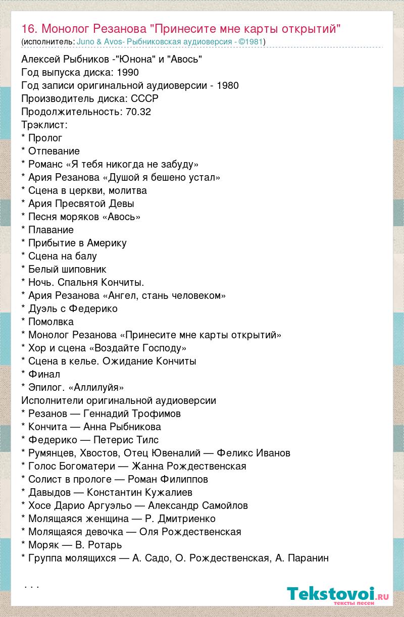 Алексей Рыбников -"Юнона" и "Авось" Год выпуска диска: 1990 Год записи оригинальной аудиоверсии - 1980 Производитель диска: СССР Продолжительность: 70.32 Трэклист: * Пролог * Отпевание * Романс «Я тебя никогда не забуду» * Ария Резанова «Душой я бешено устал» * Сцена в церкви, молитва * Ария Пресвятой Девы * Песня моряков «Авось» * Плавание * Прибытие в Америку * Сцена на балу * Белый шиповник * Ночь. Спальня Кончиты. * Ария Резанова «Ангел, стань человеком» * Дуэль с Федерико * Помолвка * Монолог Резанова «Принесите мне карты открытий» * Хор и сцена «Воздайте Господу» * Сцена в келье. Ожидание Кончиты * Финал * Эпилог. «Аллилуйя» Исполнители оригинальной аудиоверсии * Резанов — Геннадий Трофимов * Кончита — Анна Рыбникова * Федерико — Петерис Тилс * Румянцев, Хвостов, Отец Ювеналий — Феликс Иванов * Голос Богоматери — Жанна Рождественская * Солист в прологе — Роман Филиппов * Давыдов — Константин Кужалиев * Хосе Дарио Аргуэльо — Александр Самойлов * Молящаяся женщина — Р. Дмитриенко * Молящаяся девочка — Оля Рождественская * Моряк — В. Ротарь * Группа молящихся — А. Садо, О. Рождественская, А. Паранин . . .
