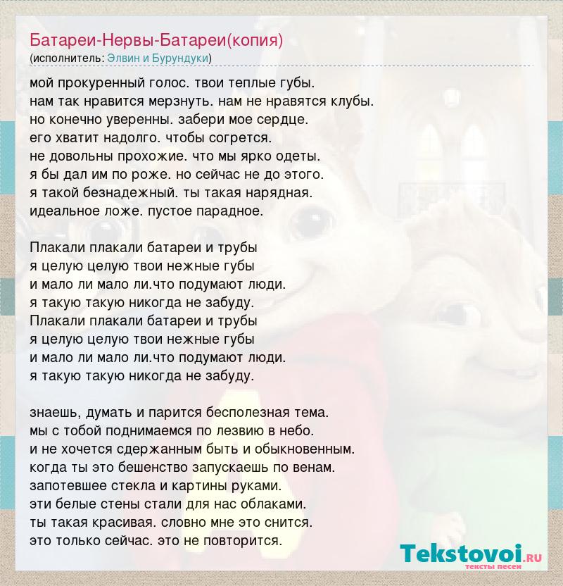мой прокуренный голос. твои теплые губы. нам так нравится мерзнуть. нам не нравятся клубы. но конечно уверенны. забери мое сердце. его хватит надолго. чтобы согрется. не довольны прохожие. что мы ярко одеты. я бы дал им по роже. но сейчас не до этого. я такой безнадежный. ты такая нарядная. идеальное ложе. пустое парадное. Плакали плакали батареи и трубы я целую целую твои нежные губы и мало ли мало ли.что подумают люди. я такую такую никогда не забуду. Плакали плакали батареи и трубы я целую целую твои нежные губы и мало ли мало ли.что подумают люди. я такую такую никогда не забуду. знаешь, думать и парится бесполезная тема. мы с тобой поднимаемся по лезвию в небо. и не хочется сдержанным быть и обыкновенным. когда ты это бешенство запускаешь по венам. запотевшее стекла и картины руками. эти белые стены стали для нас облаками. ты такая красивая. словно мне это снится. это только сейчас. это не повторится.