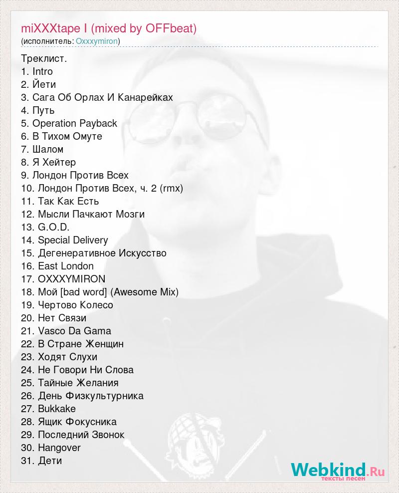 Треклист. 1. Intro 2. Йети 3. Сага Об Орлах И Канарейках 4. Путь 5. Operation Payback 6. В Тихом Омуте 7. Шалом 8. Я Хейтер 9. Лондон Против Всех 10. Лондон Против Всех, ч. 2 (rmx) 11. Так Как Есть 12. Мысли Пачкают Мозги 13. G.O.D. 14. Special Delivery 15. Дегенеративное Искусство 16. East London 17. OXXXYMIRON 18. Мой [bad word] (Awesome Mix) 19. Чертово Колесо 20. Нет Связи 21. Vasco Da Gama 22. В Стране Женщин 23. Ходят Слухи 24. Не Говори Ни Слова 25. Тайные Желания 26. День Физкультурника 27. Bukkake 28. Ящик Фокусника 29. Последний Звонок 30. Hangover 31. Дети