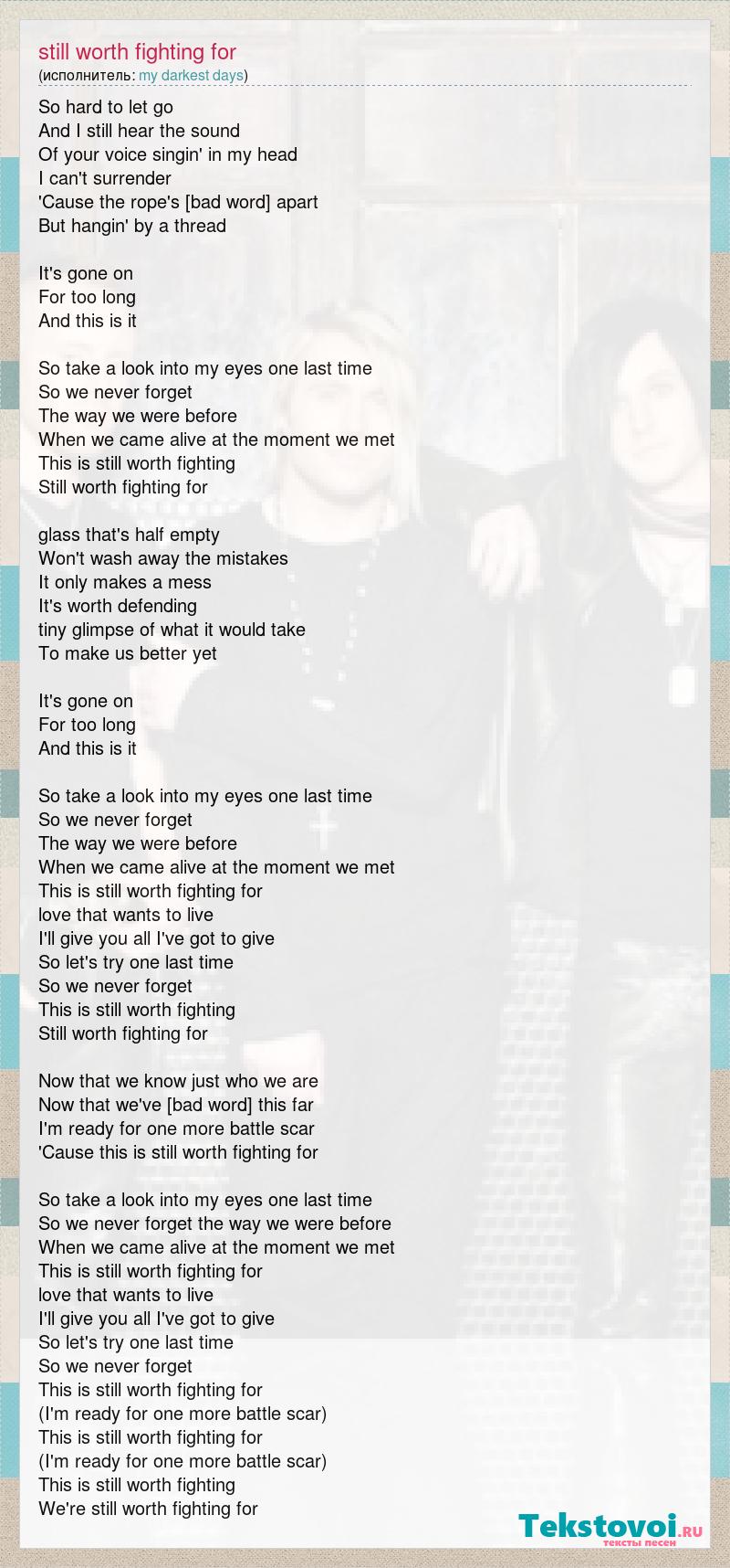 So hard to let go And I still hear the sound Of your voice singin' in my head I can't surrender 'Cause the rope's slowly coming apart But hangin' by a thread It's gone on For too long And this is it So take a look into my eyes one last time So we never forget The way we were before When we came alive at the moment we met This is still worth fighting Still worth fighting for glass that's half empty Won't wash away the mistakes It only makes a mess It's worth defending tiny glimpse of what it would take To make us better yet It's gone on For too long And this is it So take a look into my eyes one last time So we never forget The way we were before When we came alive at the moment we met This is still worth fighting for love that wants to live I'll give you all I've got to give So let's try one last time So we never forget This is still worth fighting Still worth fighting for Now that we know just who we are Now that we've finally come this far I'm ready for one more battle scar 'Cause this is still worth fighting for So take a look into my eyes one last time So we never forget the way we were before When we came alive at the moment we met This is still worth fighting for love that wants to live I'll give you all I've got to give So let's try one last time So we never forget This is still worth fighting for (I'm ready for one more battle scar) This is still worth fighting for (I'm ready for one more battle scar) This is still worth fighting We're still worth fighting for