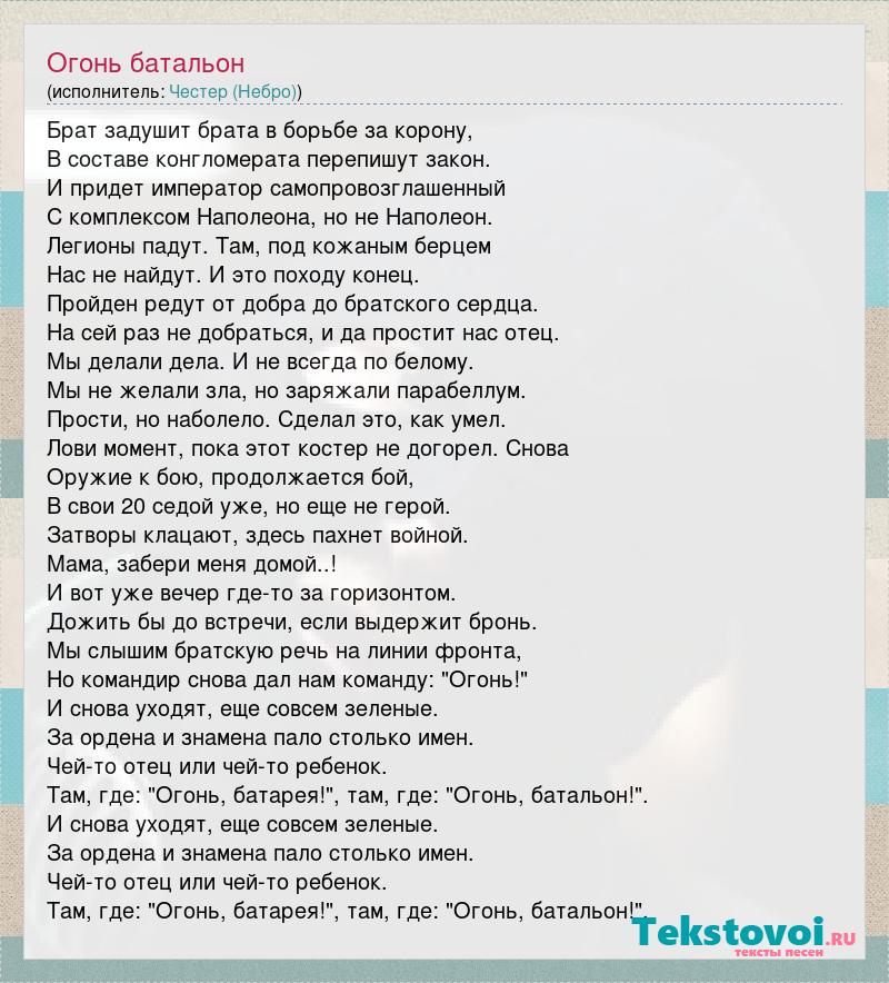Брат задушит брата в борьбе за корону, В составе конгломерата перепишут закон. И придет император самопровозглашенный С комплексом Наполеона, но не Наполеон. Легионы падут. Там, под кожаным берцем Нас не найдут. И это походу конец. Пройден редут от добра до братского сердца. На сей раз не добраться, и да простит нас отец. Мы делали дела. И не всегда по белому. Мы не желали зла, но заряжали парабеллум. Прости, но наболело. Сделал это, как умел. Лови момент, пока этот костер не догорел. Снова Оружие к бою, продолжается бой, В свои 20 седой уже, но еще не герой. Затворы клацают, здесь пахнет войной. Мама, забери меня домой..! И вот уже вечер где-то за горизонтом. Дожить бы до встречи, если выдержит бронь. Мы слышим братскую речь на линии фронта, Но командир снова дал нам команду: "Огонь!" И снова уходят, еще совсем зеленые. За ордена и знамена пало столько имен. Чей-то отец или чей-то ребенок. Там, где: "Огонь, батарея!", там, где: "Огонь, батальон!". И снова уходят, еще совсем зеленые. За ордена и знамена пало столько имен. Чей-то отец или чей-то ребенок. Там, где: "Огонь, батарея!", там, где: "Огонь, батальон!".