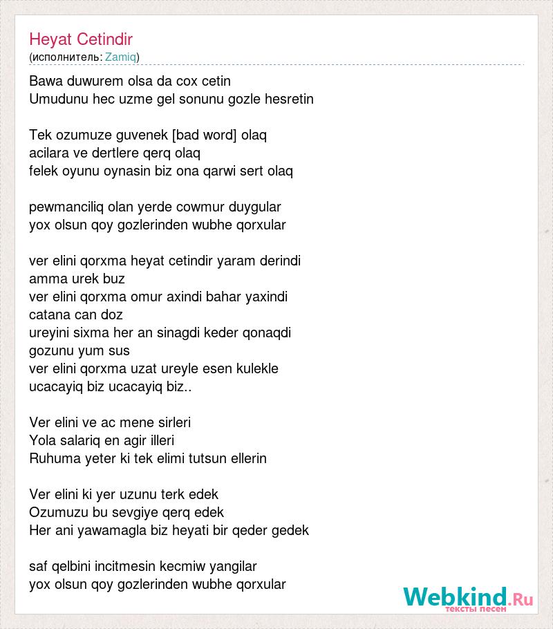 Bawa duwurem olsa da cox cetin Umudunu hec uzme gel sonunu gozle hesretin Tek ozumuze guvenek [bad word] olaq acilara ve dertlere qerq olaq felek oyunu oynasin biz ona qarwi sert olaq pewmanciliq olan yerde cowmur duygular yox olsun qoy gozlerinden wubhe qorxular ver elini qorxma heyat cetindir yaram derindi amma urek buz ver elini qorxma omur axindi bahar yaxindi catana can doz ureyini sixma her an sinagdi keder qonaqdi gozunu yum sus ver elini qorxma uzat ureyle esen kulekle ucacayiq biz ucacayiq biz.. Ver elini ve ac mene sirleri Yola salariq en agir illeri Ruhuma yeter ki tek elimi tutsun ellerin Ver elini ki yer uzunu terk edek Ozumuzu bu sevgiye qerq edek Her ani yawamagla biz heyati bir qeder gedek saf qelbini incitmesin kecmiw yangilar yox olsun qoy gozlerinden wubhe qorxular