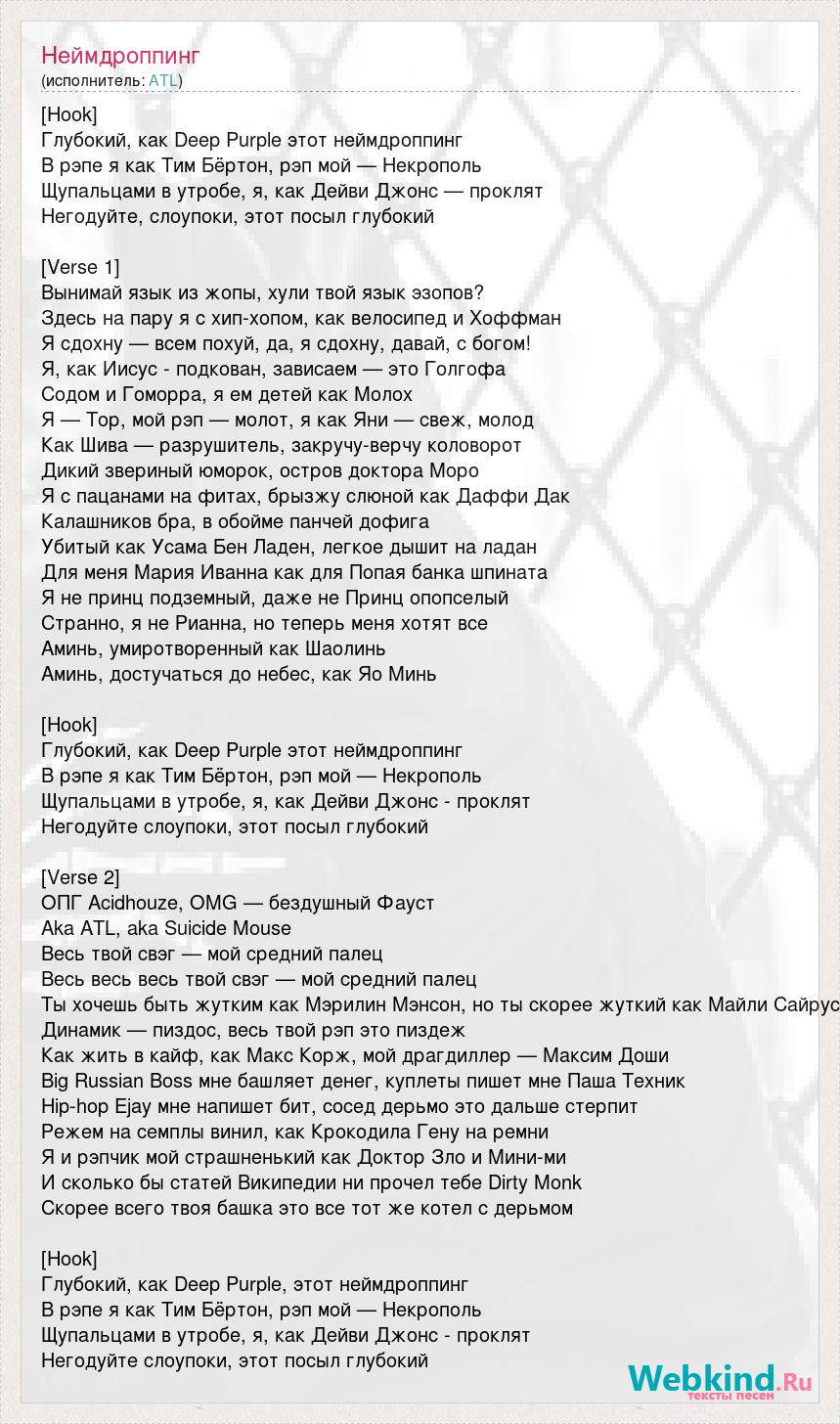 [Hook] Глубокий, как Deep Purple этот неймдроппинг В рэпе я как Тим Бёртон, рэп мой — Некрополь Щупальцами в утробе, я, как Дейви Джонс — проклят Негодуйте, слоупоки, этот посыл глубокий [Verse 1] Вынимай язык из жопы, хули твой язык эзопов? Здесь на пару я с хип-хопом, как велосипед и Хоффман Я сдохну — всем похуй, да, я сдохну, давай, с богом! Я, как Иисус - подкован, зависаем — это Голгофа Содом и Гоморра, я ем детей как Молох Я — Тор, мой рэп — молот, я как Яни — свеж, молод Как Шива — разрушитель, закручу-верчу коловорот Дикий звериный юморок, остров доктора Моро Я с пацанами на фитах, брызжу слюной как Даффи Дак Калашников бра, в обойме панчей дофига Убитый как Усама Бен Ладен, легкое дышит на ладан Для меня Мария Иванна как для Попая банка шпината Я не принц подземный, даже не Принц опопселый Странно, я не Рианна, но теперь меня хотят все Аминь, умиротворенный как Шаолинь Аминь, достучаться до небес, как Яо Минь [Hook] Глубокий, как Deep Purple этот неймдроппинг В рэпе я как Тим Бёртон, рэп мой — Некрополь Щупальцами в утробе, я, как Дейви Джонс - проклят Негодуйте слоупоки, этот посыл глубокий [Verse 2] ОПГ Acidhouze, OMG — бездушный Фауст Aka ATL, aka Suicide Mouse Весь твой свэг — мой средний палец Весь весь весь твой свэг — мой средний палец Ты хочешь быть жутким как Мэрилин Мэнсон, но ты скорее жуткий как Майли Сайрус Динамик — пиздос, весь твой рэп это пиздеж Как жить в кайф, как Макс Корж, мой драгдиллер — Максим Доши Big Russian Boss мне башляет денег, куплеты пишет мне Паша Техник Hip-hop Ejay мне напишет бит, сосед дерьмо это дальше стерпит Режем на семплы винил, как Крокодила Гену на ремни Я и рэпчик мой страшненький как Доктор Зло и Мини-ми И сколько бы статей Википедии ни прочел тебе Dirty Monk Cкорее всего твоя башка это все тот же котел с дерьмом [Hook] Глубокий, как Deep Purple, этот неймдроппинг В рэпе я как Тим Бёртон, рэп мой — Некрополь Щупальцами в утробе, я, как Дейви Джонс - проклят Негодуйте слоупоки, этот посыл глубокий