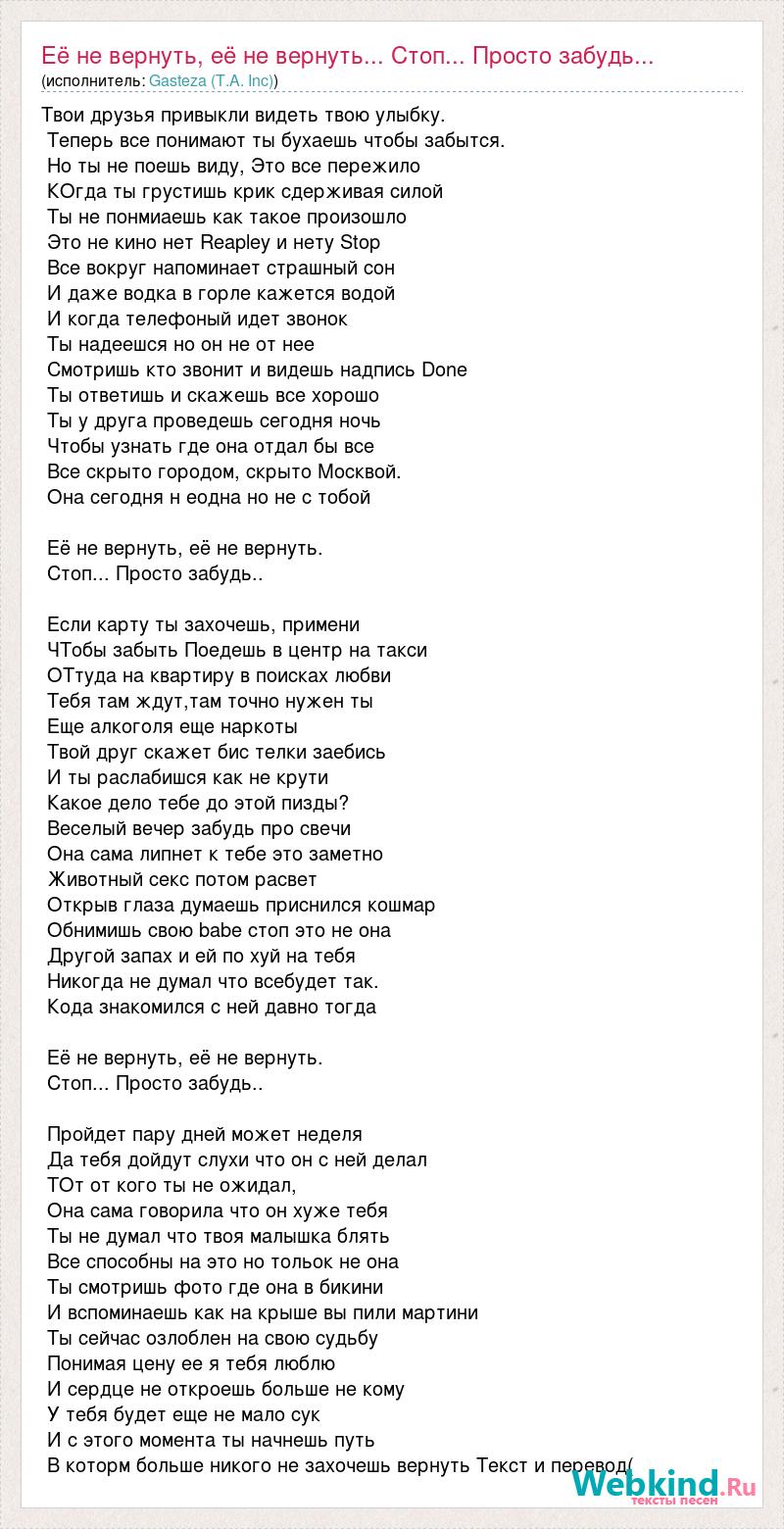 Твои друзья привыкли видеть твою улыбку. Теперь все понимают ты бухаешь чтобы забытся. Но ты не поешь виду, Это все пережило КОгда ты грустишь крик сдерживая силой Ты не понмиаешь как такое произошло Это не кино нет Reapley и нету Stop Все вокруг напоминает страшный сон И даже водка в горле кажется водой И когда телефоный идет звонок Ты надеешся но он не от нее Смотришь кто звонит и видешь надпись Done Ты ответишь и скажешь все хорошо Ты у друга проведешь сегодня ночь Чтобы узнать где она отдал бы все Все скрыто городом, скрыто Москвой. Она сегодня н еодна но не с тобой Её не вернуть, её не вернуть. Стоп... Просто забудь.. Если карту ты захочешь, примени ЧТобы забыть Поедешь в центр на такси ОТтуда на квартиру в поисках любви Тебя там ждут,там точно нужен ты Еще алкоголя еще наркоты Твой друг скажет бис телки заебись И ты раслабишся как не крути Какое дело тебе до этой пизды? Веселый вечер забудь про свечи Она сама липнет к тебе это заметно Животный секс потом расвет Открыв глаза думаешь приснился кошмар Обнимишь свою babe стоп это не она Другой запах и ей по хуй на тебя Никогда не думал что всебудет так. Кода знакомился с ней давно тогда Её не вернуть, её не вернуть. Стоп... Просто забудь.. Пройдет пару дней может неделя Да тебя дойдут слухи что он с ней делал ТОт от кого ты не ожидал, Она сама говорила что он хуже тебя Ты не думал что твоя малышка блять Все способны на это но тольок не она Ты смотришь фото где она в бикини И вспоминаешь как на крыше вы пили мартини Ты сейчас озлоблен на свою судьбу Понимая цену ее я тебя люблю И сердце не откроешь больше не кому У тебя будет еще не мало сук И с этого момента ты начнешь путь В которм больше никого не захочешь вернуть Текст и перевод(