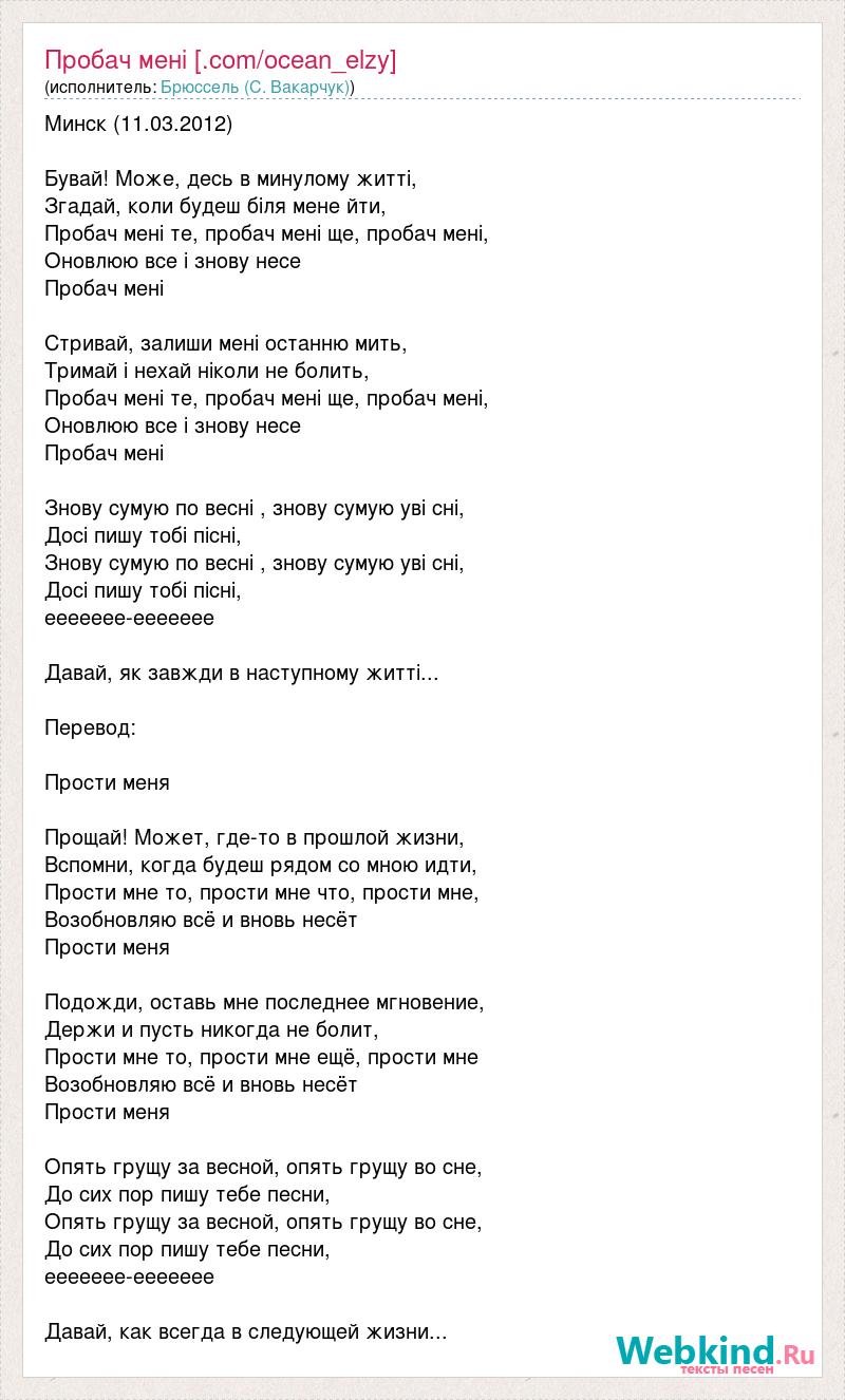 Минск (11.03.2012) Бувай! Може, десь в минулому житті, Згадай, коли будеш біля мене йти, Пробач мені те, пробач мені ще, пробач мені, Оновлюю все і знову несе Пробач мені Стривай, залиши мені останню мить, Тримай і нехай ніколи не болить, Пробач мені те, пробач мені ще, пробач мені, Оновлюю все і знову несе Пробач мені Знову сумую по весні , знову сумую уві сні, Досі пишу тобі пісні, Знову сумую по весні , знову сумую уві сні, Досі пишу тобі пісні, еееееее-еееееее Давай, як завжди в наступному житті... Перевод: Прости меня Прощай! Может, где-то в прошлой жизни, Вспомни, когда будеш рядом со мною идти, Прости мне то, прости мне что, прости мне, Возобновляю всё и вновь несёт Прости меня Подожди, оставь мне последнее мгновение, Держи и пусть никогда не болит, Прости мне то, прости мне ещё, прости мне Возобновляю всё и вновь несёт Прости меня Опять грущу за весной, опять грущу во сне, До сих пор пишу тебе песни, Опять грущу за весной, опять грущу во сне, До сих пор пишу тебе песни, еееееее-еееееее Давай, как всегда в следующей жизни...