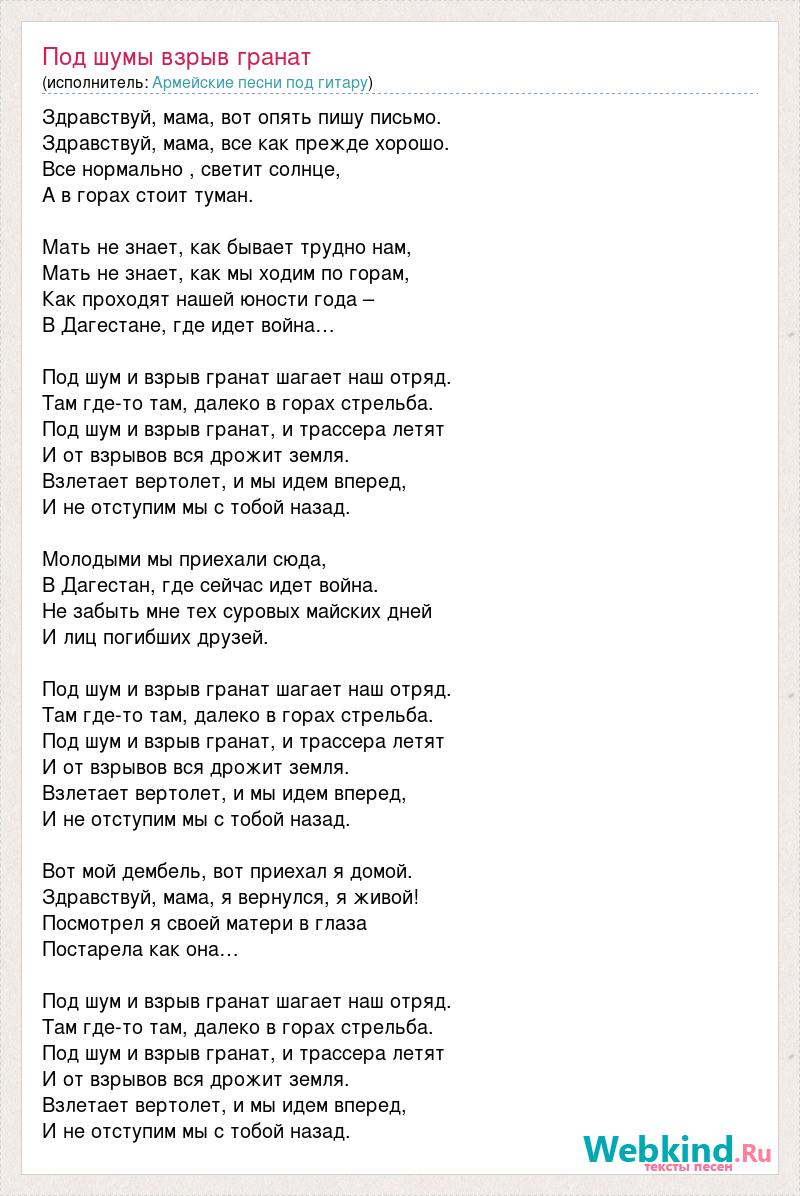 Здравствуй, мама, вот опять пишу письмо. Здравствуй, мама, все как прежде хорошо. Все нормально , светит солнце, А в горах стоит туман. Мать не знает, как бывает трудно нам, Мать не знает, как мы ходим по горам, Как проходят нашей юности года – В Дагестане, где идет война… Под шум и взрыв гранат шагает наш отряд. Там где-то там, далеко в горах стрельба. Под шум и взрыв гранат, и трассера летят И от взрывов вся дрожит земля. Взлетает вертолет, и мы идем вперед, И не отступим мы с тобой назад. Молодыми мы приехали сюда, В Дагестан, где сейчас идет война. Не забыть мне тех суровых майских дней И лиц погибших друзей. Под шум и взрыв гранат шагает наш отряд. Там где-то там, далеко в горах стрельба. Под шум и взрыв гранат, и трассера летят И от взрывов вся дрожит земля. Взлетает вертолет, и мы идем вперед, И не отступим мы с тобой назад. Вот мой дембель, вот приехал я домой. Здравствуй, мама, я вернулся, я живой! Посмотрел я своей матери в глаза Постарела как она… Под шум и взрыв гранат шагает наш отряд. Там где-то там, далеко в горах стрельба. Под шум и взрыв гранат, и трассера летят И от взрывов вся дрожит земля. Взлетает вертолет, и мы идем вперед, И не отступим мы с тобой назад.