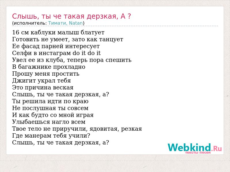16 см каблуки малыш блатует Готовить не умеет, зато как танцует Ее фасад парней интересует Селфи в инстаграм do it do it Увел ее из клуба, теперь пора спешить В багажнике прохладно Прошу меня простить Джигит украл тебя Это причина веская Слышь, ты че такая дерзкая, а? Ты решила идти по краю Не послушная ты совсем И как будто со мной играя Улыбаешься нагло всем Твое тело не приручили, ядовитая, резкая Где манерам тебя учили? Слышь, ты че такая дерзкая, а?