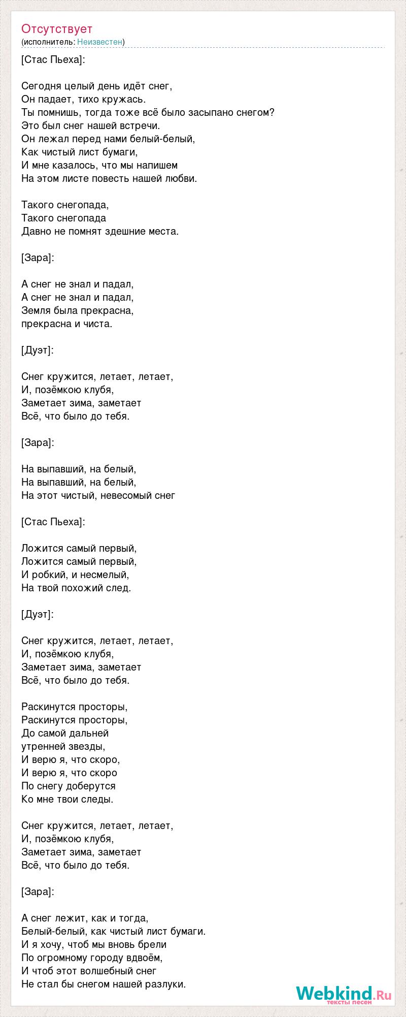[Стас Пьеха]: Сегодня целый день идёт снег, Он падает, тихо кружась. Ты помнишь, тогда тоже всё было засыпано снегом? Это был снег нашей встречи. Он лежал перед нами белый-белый, Как чистый лист бумаги, И мне казалось, что мы напишем На этом листе повесть нашей любви. Такого снегопада, Такого снегопада Давно не помнят здешние места. [Зара]: А снег не знал и падал, А снег не знал и падал, Земля была прекрасна, прекрасна и чиста. [Дуэт]: Снег кружится, летает, летает, И, позёмкою клубя, Заметает зима, заметает Всё, что было до тебя. [Зара]: На выпавший, на белый, На выпавший, на белый, На этот чистый, невесомый снег [Стас Пьеха]: Ложится самый первый, Ложится самый первый, И робкий, и несмелый, На твой похожий след. [Дуэт]: Снег кружится, летает, летает, И, позёмкою клубя, Заметает зима, заметает Всё, что было до тебя. Раскинутся просторы, Раскинутся просторы, До самой дальней утренней звезды, И верю я, что скоро, И верю я, что скоро По снегу доберутся Ко мне твои следы. Снег кружится, летает, летает, И, позёмкою клубя, Заметает зима, заметает Всё, что было до тебя. [Зара]: А снег лежит, как и тогда, Белый-белый, как чистый лист бумаги. И я хочу, чтоб мы вновь брели По огромному городу вдвоём, И чтоб этот волшебный снег Не стал бы снегом нашей разлуки.