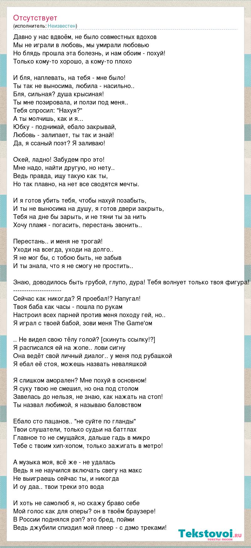 Давно у нас вдвоём, не было совместных вдохов Мы не играли в любовь, мы умирали любовью Но блядь прошла эта болезнь, и нам обоим - похуй! Только кому-то хорошо, а кому-то плохо И бля, наплевать, на тебя - мне было! Ты так не выносима, любила - насильно.. Бля, сильная? душа крысиная! Ты мне позировала, и ползи под меня.. Тебя спросил: "Нахуя?" А ты молчишь, как и я... Юбку - поднимай, ебало закрывай, Любовь - залипает, ты так и знай! Да, я ссаный поэт? Я заливаю! Окей, ладно! Забудем про это! Мне надо, найти другую, но нету.. Ведь правда, ищу такую как ты, Но так плавно, на нет все сводятся мечты. И я готов убить тебя, чтобы нахуй позабыть, И ты не выносима на душу, я готов двери закрыть, Тебя на дне бы зарыть, и не тяни ты за нить Хочу пламя - погасить, перестань звонить.. Перестань.. и меня не трогай! Уходи на всегда, уходи на долго.. Я не мог бы, с тобою быть, не забыв И ты знала, что я не смогу не простить.. Знаю, доводилось быть грубой, глупо, дура! Тебя волнует только твоя фигура! ---------------------- Сейчас как никогда? Я проебал!? Напугал! Твоя баба как часы - пошла по рукам Настроил всех парней против меня походу гей, но.. Я играл с твоей бабой, зови меня The Game'ом .. Не видел свою тёлу голой? [скинуть ссылку!?] Я расписался ей на жопе.. лови сигну Она ведёт свой личный диалог.. у меня под рубашкой Я ебал её стоя, можешь назвать неваляшкой Я слишком аморален? Мне похуй в основном! Я суку твою не смешил, но она под столом Завелась до нельзя, не знаю, как нажать на стоп! Ты назвал любимой, я называю баловством Ебало сто пацанов.. "не суйте по гланды" Твои слушатели, только судьи на баттлах Главное то не смущайся, дальше гадь в микро Тебе с твоим хип-хопом, только зажигать в метро! А музыка моя, всё же - не удалась Ведь я не научился включать свегу на макс Не выиграешь сейчас ты, и никогда И оу даа.. твои треки это вода И хоть не самолюб я, но скажу браво себе Мой голос как для оперы? он в твоём браузере! В России поднялся рэп? это бред, пойми Ведь джубили спиздил мой плеер - с дэмо треками!
